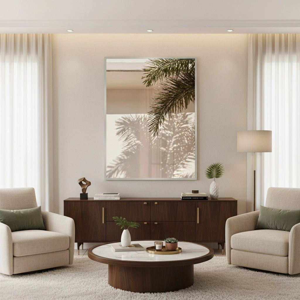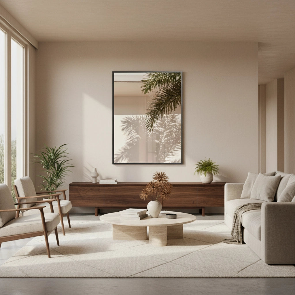 The tranquil Boho Desert Chic Palm Leaf print captures a moment of sun-drenched tropical serenity. This piece features a close-up photograph of a palm frond casting intricate shadows onto a warm, textured soft pink/beige wall. The play of natural light and shadow creates a minimalist, warm, and distinctly Bohemian atmosphere. It is an ideal piece for adding resort-style calm and desert-chic sophistication to a living space, bedroom, or entryway in Dubai.
