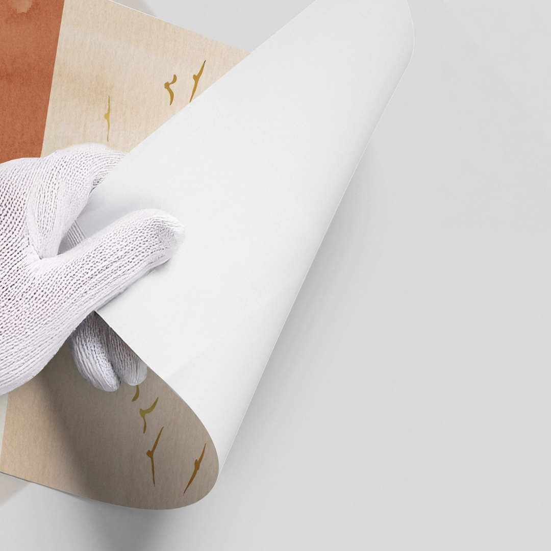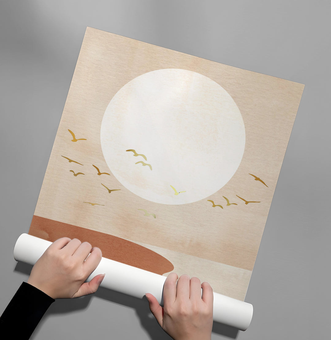 The tranquil and stylish Boho Gold Birds print is a perfect example of abstract desert chic. This canvas features a minimalist design with an ethereal white circle and an abstract terracotta shape, set against soft beige tones. The scene is brought to life by a flock of sweeping birds rendered in exquisite metallic gold foil, adding a touch of Bohemian luxury and warmth to any calm, contemporary interior in Dubai.