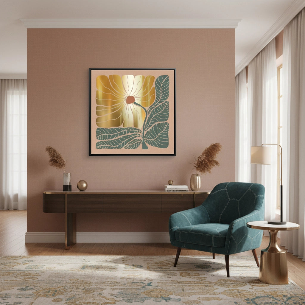 The opulent Boho Gold Bloom and Leaves print brings together bohemian charm and metallic luxury in a striking square format. This canvas features a highly stylized, geometric flower head rendered entirely in shimmering metallic gold foil. The bloom is framed by bold, contrasting dark teal/grey-green leaves against a soft blush pink background. This piece is perfect for adding luxe texture, earthy glamour, and a bold botanical statement to a gallery wall or accent space in Dubai.