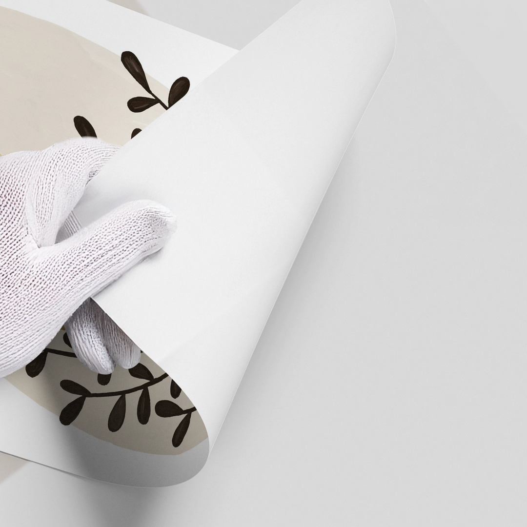 The striking Boho Gold Pot and Vine print merges modern bohemian design with luxurious accents. This canvas features dark, stylized vine leaves emerging from a bold, geometric vase. The pot shines brightly, rendered completely in reflective metallic gold foil, which contrasts beautifully against the soft, neutral abstract shapes in the background. This piece is perfect for adding a touch of gilded organic glamour to an entryway, dining room, or sophisticated living space in Dubai.