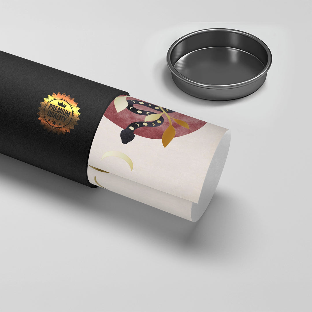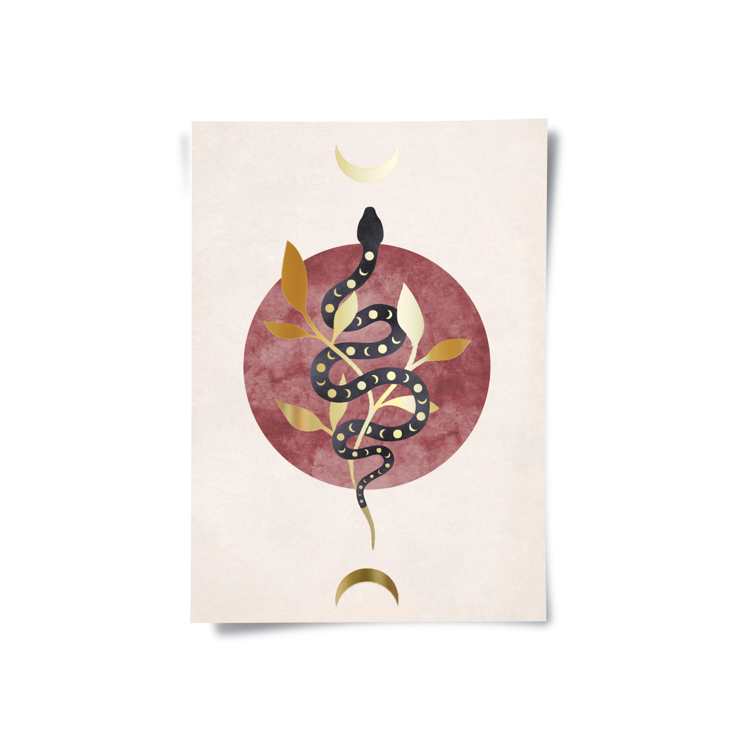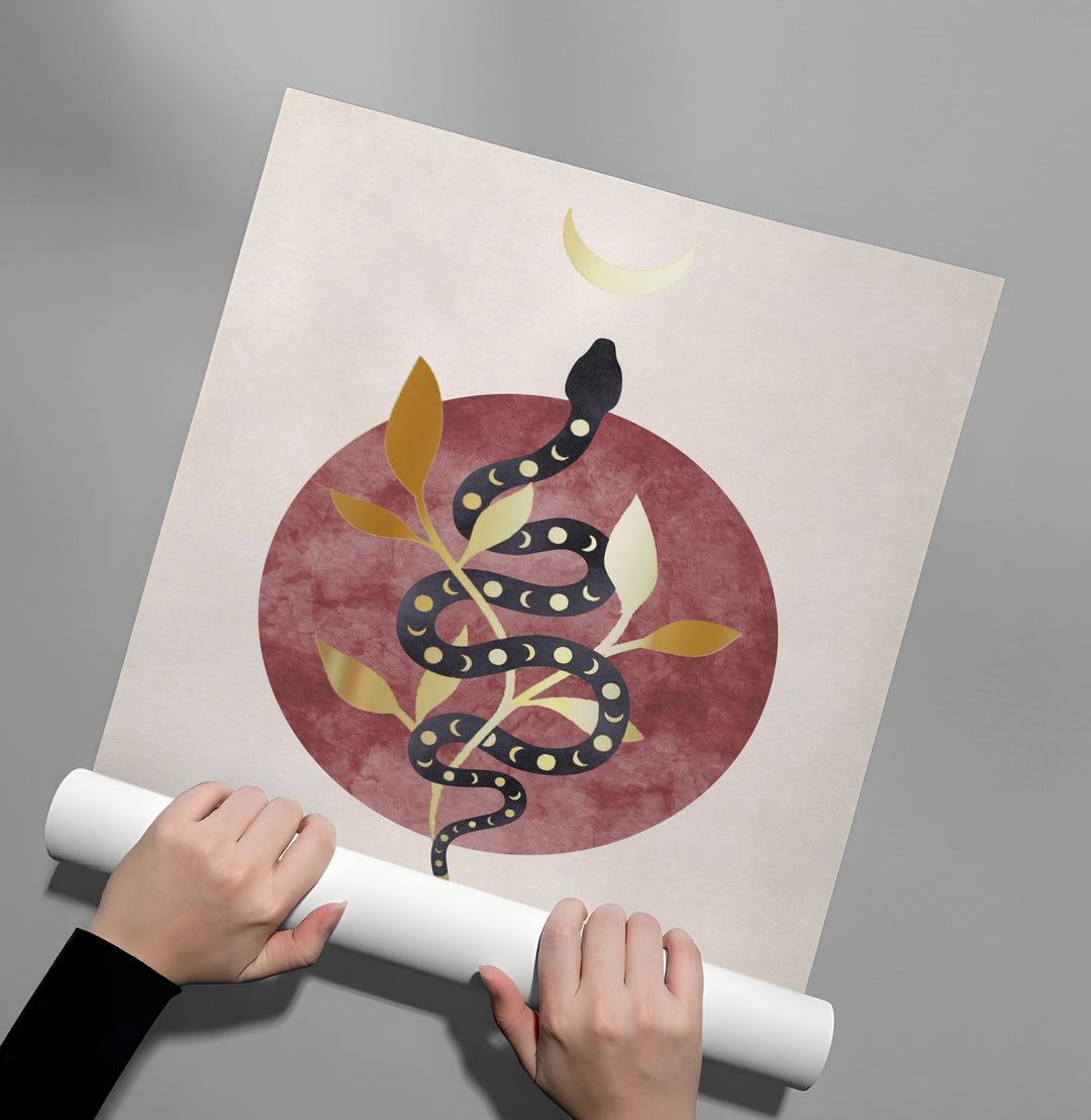 The mystical Boho Gold Snake print is a striking piece of Bohemian abstract art with spiritual undertones. This canvas features a sinuous black snake adorned with small gold moons, coiling around a metallic gold foil vine. The design is centered within a rich, earthy maroon circle, set against a calm, neutral backdrop. Symbolic of rebirth and transformation, this unique artwork adds a touch of gilded mystery and organic glamour to a chic living space or meditative corner in Dubai.