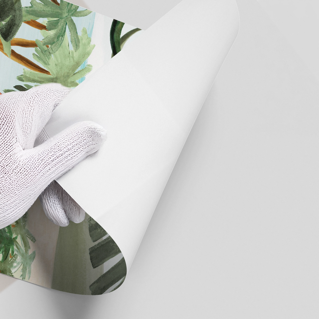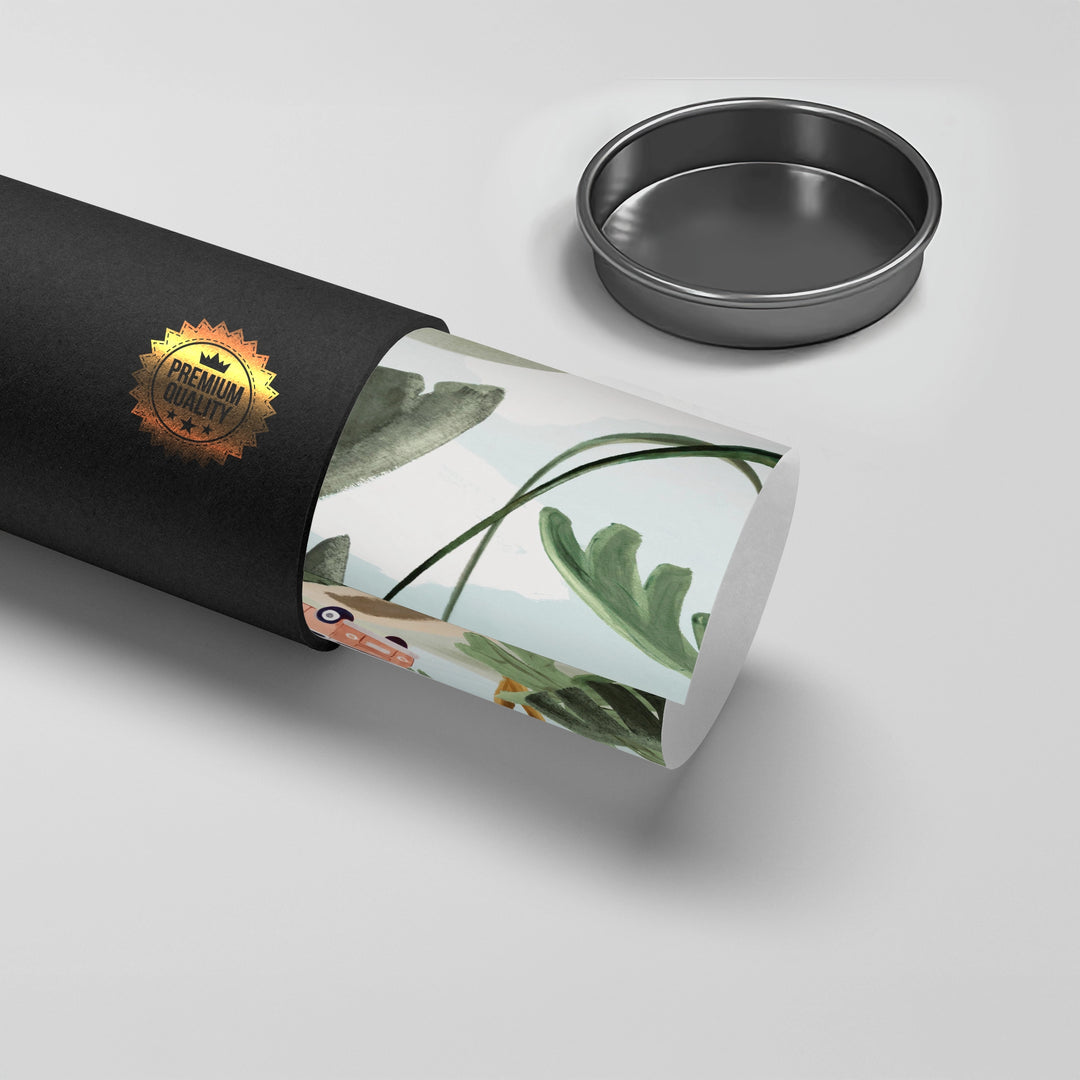 The adventurous Boho Jungle Van print captures the spirit of tropical freedom and Bohemian wanderlust. This canvas features a stylized, hand-painted jungle landscape with lush palm fronds and a cute pink/coral vintage van driving toward the coast. It's a whimsical and vibrant piece that adds a refreshing, tropical chic touch to any living space, bedroom, or unique office in Dubai.