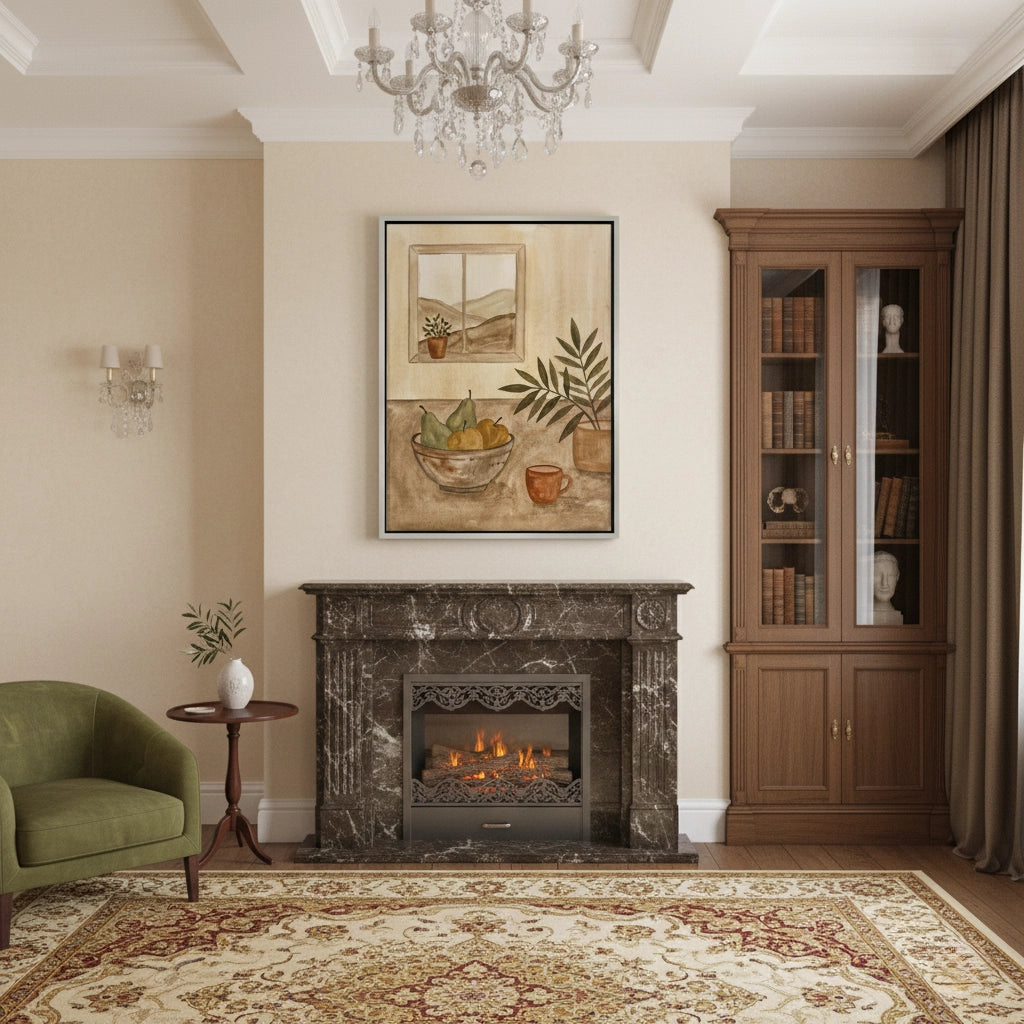 Add a touch of cozy elegance to your home with Boho Kitchen from Jasmine Art’s Bohemian series. This charming watercolor print captures a serene still life featuring a bowl of fresh fruit, a warm coffee cup, and lush indoor greenery against a scenic window view. Its earthy palette of terracotta, olive, and beige creates a warm, inviting atmosphere perfect for any culinary space. Finished with our signature premium vertical texture, this print offers exceptional tactile depth and a high-end gallery finish. An ideal centerpiece for a modern kitchen, a cozy breakfast nook, or a dining room in Dubai.
