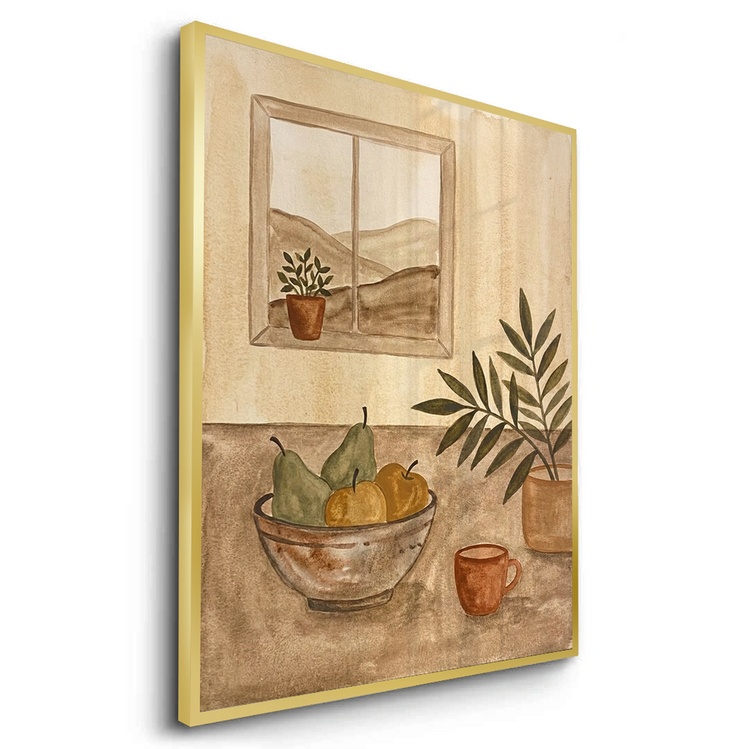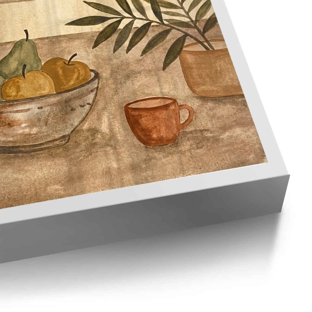Add a touch of cozy elegance to your home with Boho Kitchen from Jasmine Art’s Bohemian series. This charming watercolor print captures a serene still life featuring a bowl of fresh fruit, a warm coffee cup, and lush indoor greenery against a scenic window view. Its earthy palette of terracotta, olive, and beige creates a warm, inviting atmosphere perfect for any culinary space. Finished with our signature premium vertical texture, this print offers exceptional tactile depth and a high-end gallery finish. An ideal centerpiece for a modern kitchen, a cozy breakfast nook, or a dining room in Dubai.