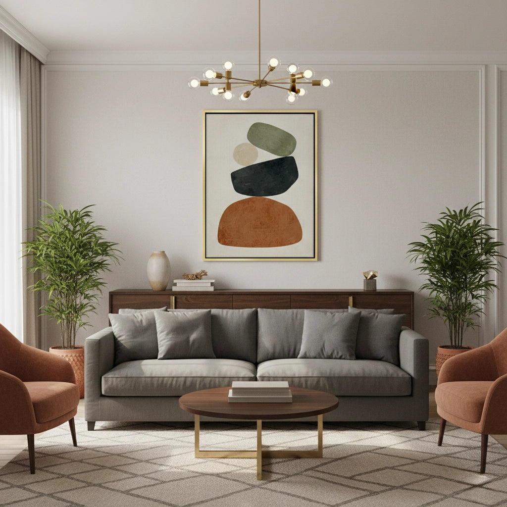 Find your inner balance with the Boho Pebble Balance from Jasmine Art’s Bohemian series. This striking abstract print features organic pebble shapes stacked in perfect harmony, rendered in earthy tones of terracotta, moss green, and deep charcoal. Its minimalist Zen aesthetic brings a sense of grounded tranquility to any modern space. Finished with our signature premium vertical texture, this print offers exceptional tactile depth and a high-end gallery finish. A perfect serene addition for a meditation corner, a minimalist bedroom, or a chic living area in Dubai.