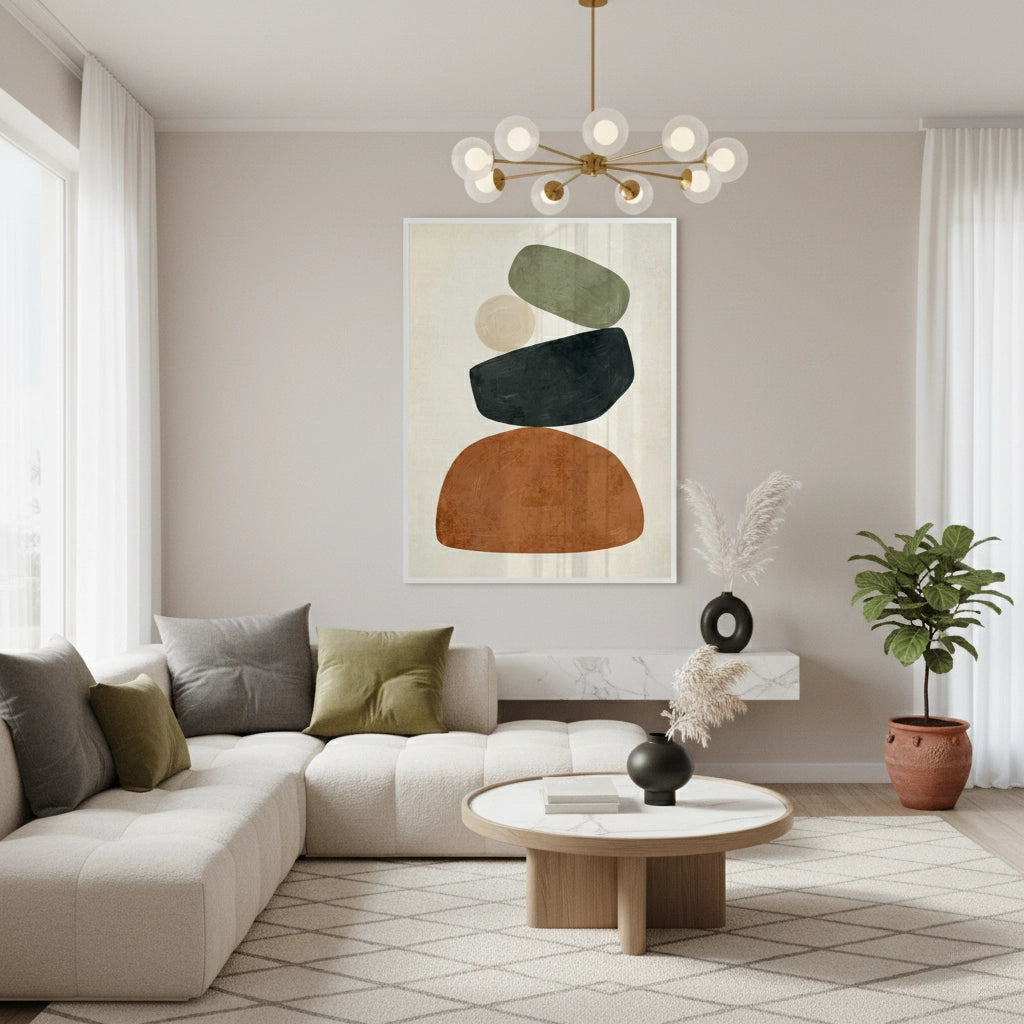 Find your inner balance with the Boho Pebble Balance from Jasmine Art’s Bohemian series. This striking abstract print features organic pebble shapes stacked in perfect harmony, rendered in earthy tones of terracotta, moss green, and deep charcoal. Its minimalist Zen aesthetic brings a sense of grounded tranquility to any modern space. Finished with our signature premium vertical texture, this print offers exceptional tactile depth and a high-end gallery finish. A perfect serene addition for a meditation corner, a minimalist bedroom, or a chic living area in Dubai.