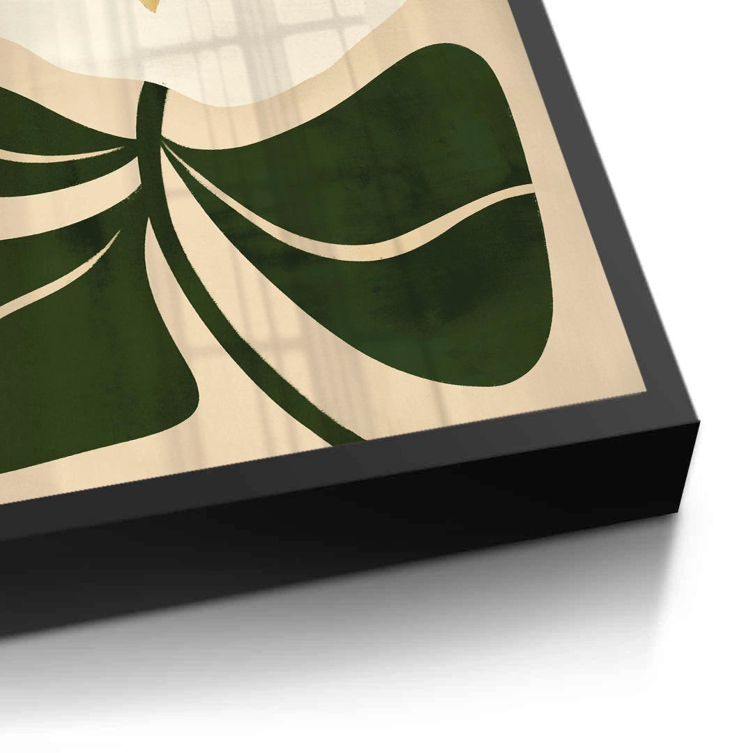 The tranquil Boho White Bloom print combines organic shapes with a touch of gilded elegance. This canvas features a large, stylized white flower with rich dark green foliage, set against a warm, earthy background. The artwork is crowned by a dazzling center accent of metallic gold foil, which captures the light and adds a subtle layer of luxury. This piece is perfect for injecting a calm, modern Bohemian botanical feeling into any elegant living space or bedroom in Dubai.