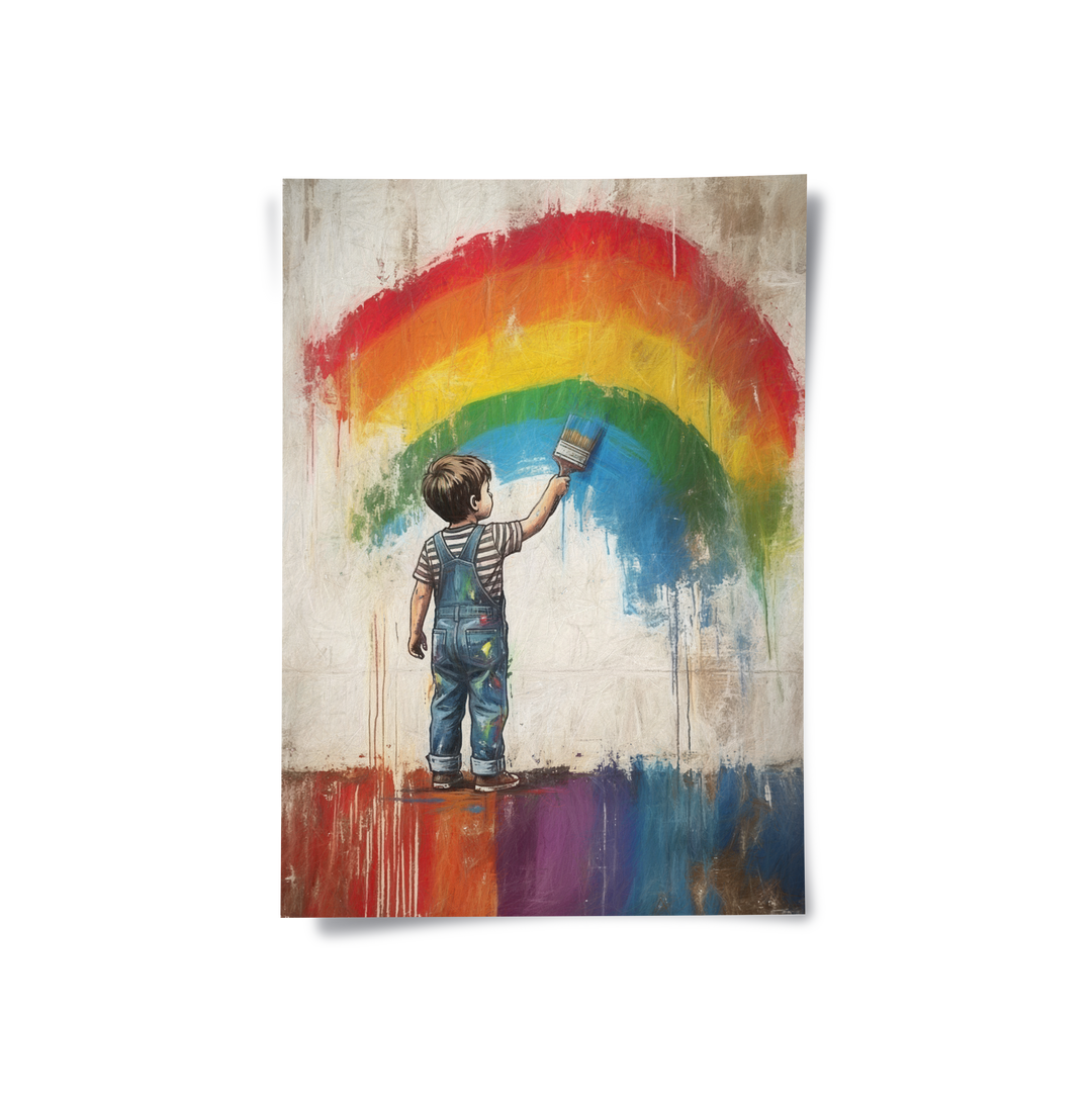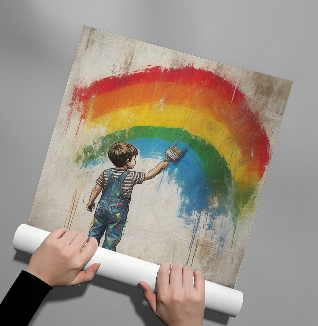 Ignite creativity in your home with the Boy Painting Rainbow from Jasmine Art’s Bohemian series. This expressive piece captures a heartwarming moment of a young boy painting a vibrant, dripping rainbow, symbolizing hope and endless imagination. The contrast between the neutral, distressed background and the vivid colors creates a powerful modern statement. Finished with our signature premium vertical texture, this print offers exceptional tactile depth and a high-end gallery finish. A perfect inspiring addition for a child's bedroom, a creative studio, or a contemporary living space in Dubai.