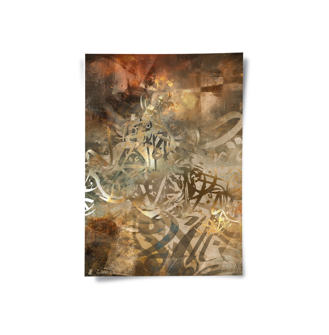 The immersive Brushstroke Calligraphy - Earthy Abstract print is a rich, textural masterpiece of abstract Islamic art. This captivating piece features dense, layered Arabic script intertwined within a vibrant palette of warm brown, rust, and burnt orange brushstrokes. Subtle golden accents and a distressed texture add a sense of history and profound artistic depth. Ideal for adding an intense, sophisticated, and culturally rich artistic statement to a modern living room or study in Dubai.