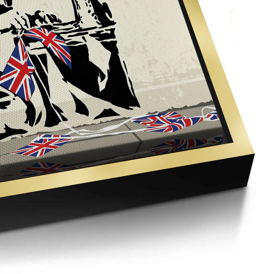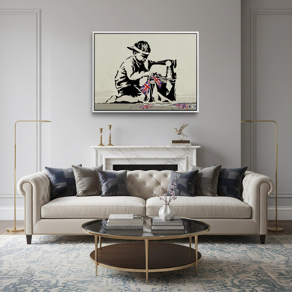 Make a powerful social statement with Bunting Boy from Jasmine Art’s Banksy series. This world-renowned stencil-style print depicts a young child sewing national flags, offering a poignant critique on modern labor and patriotism. Its high-contrast monochromatic design with vibrant flag accents brings an edgy, intellectual energy to any space. Finished with our signature premium vertical texture, this print offers exceptional tactile depth and a high-end gallery finish. A thought-provoking centerpiece for a modern office, an industrial-style loft, or a creative living room in Dubai.
