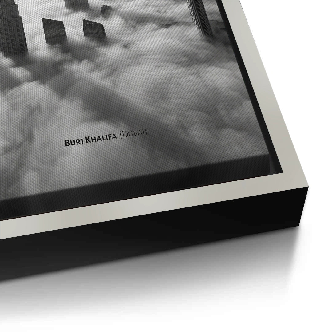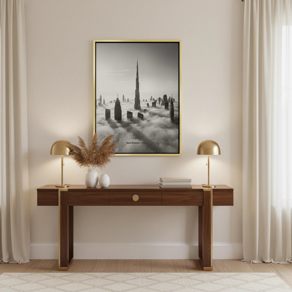 Experience the breathtaking heights of the world’s tallest building with the Burj Khalifa Above the Clouds art print. This stunning black and white photograph captures the Burj Khalifa piercing through a thick blanket of morning fog, surrounded by the peaks of Dubai’s skyline. The dream-like composition and minimalist monochrome palette evoke a sense of calm grandeur and infinite ambition. Finished with our signature premium vertical texture, this print offers a sophisticated tactile depth that transforms any wall into a luxury gallery. A perfect statement piece for a modern office, a grand hallway, or a luxury penthouse in Dubai.