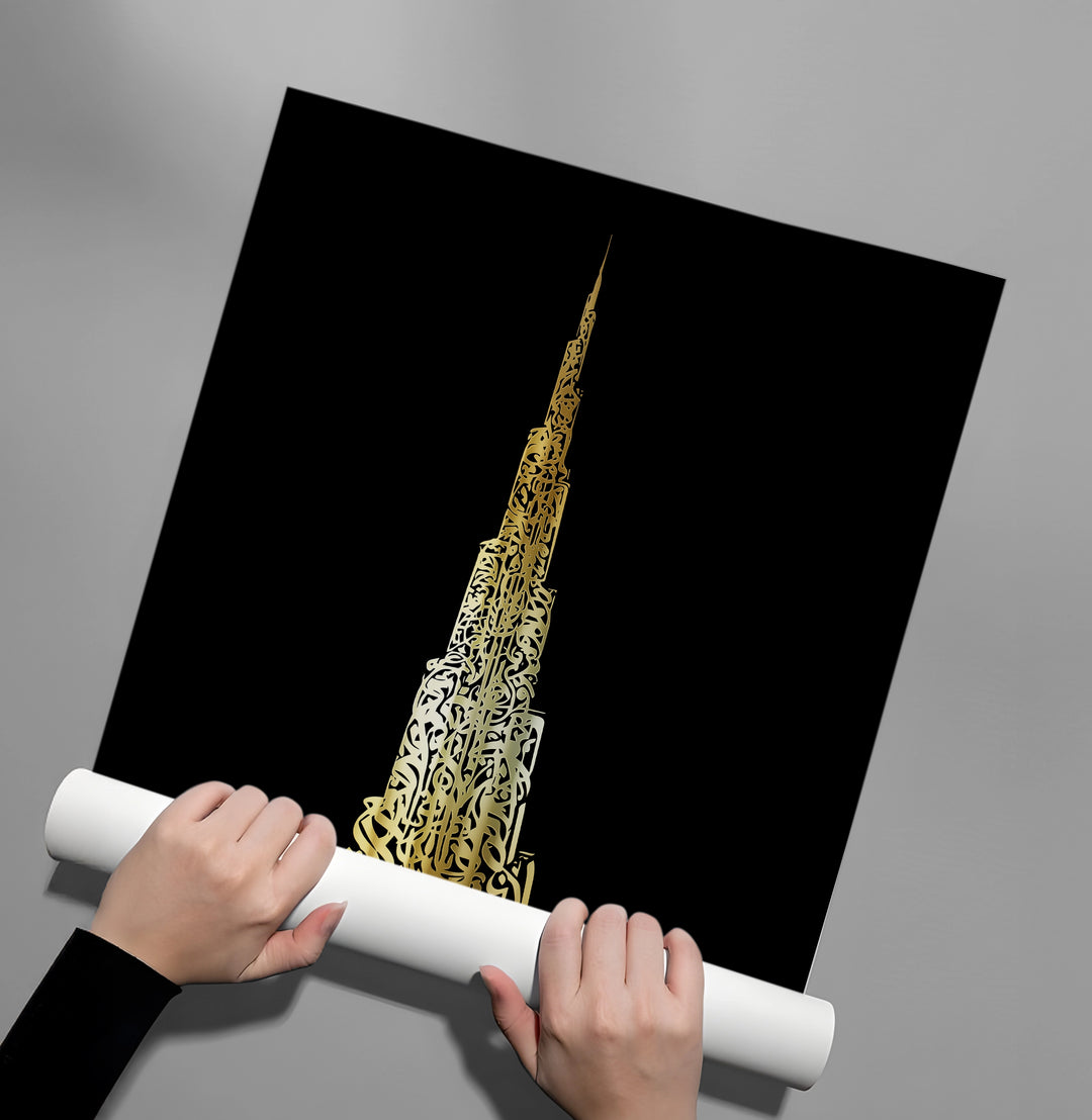 Elevate your interior with the Burj Khalifa Gold Edition, a masterpiece that blends iconic architecture with traditional artistry. This stunning print features the silhouette of the world’s tallest building, intricately formed through elegant Arabic calligraphy in radiant gold against a deep black background. The fusion of Middle Eastern heritage and modern engineering creates a powerful visual statement of luxury and ambition. Finished with our signature premium vertical texture, this artwork provides a high-end tactile experience that captures the light beautifully. A must-have for a luxury office, a grand living room, or a high-end residence in Dubai.