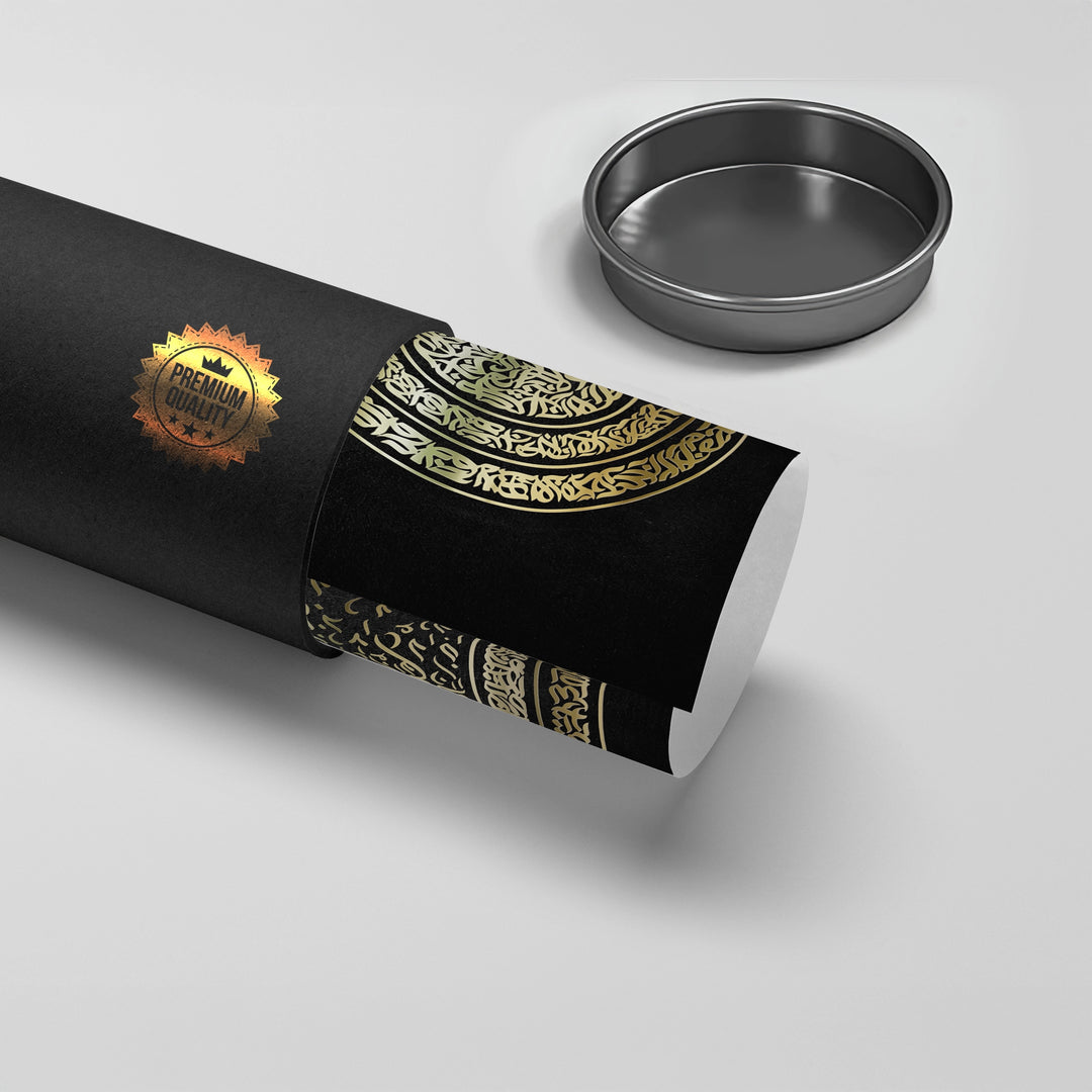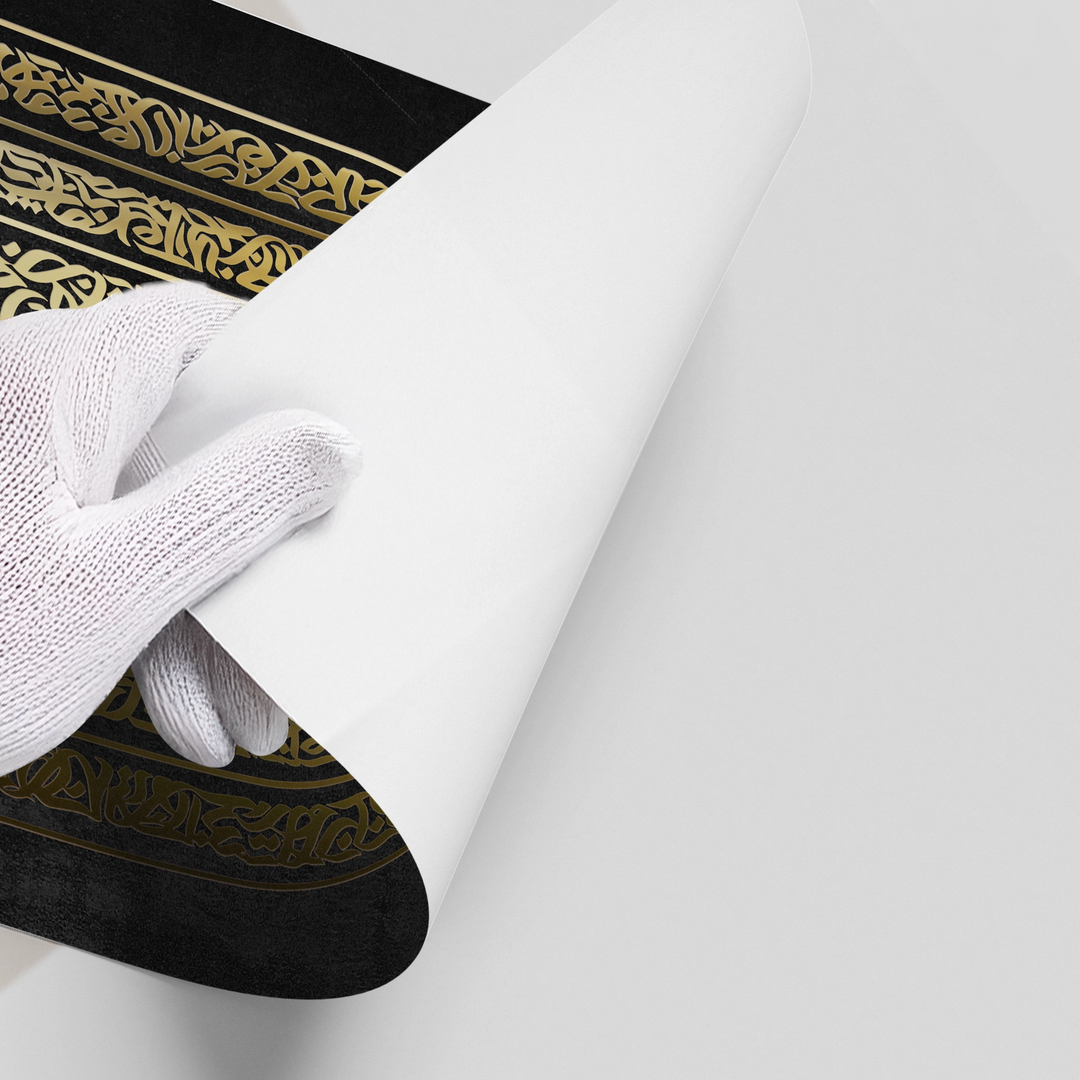 The magnificent Calligraphy Arch - The Golden Mihrab print is a striking representation of spiritual gateway and traditional design. The artwork is formed by a series of layered, golden arches, with the entire surface intricately covered in dense metallic gold Arabic calligraphy. The script subtly fades at the base, creating an ethereal, dripping effect. Set against a deep black textured background, this piece adds a profoundly spiritual, dramatic, and luxurious focal point to any upscale majlis or hallway in Dubai.
