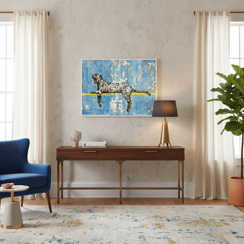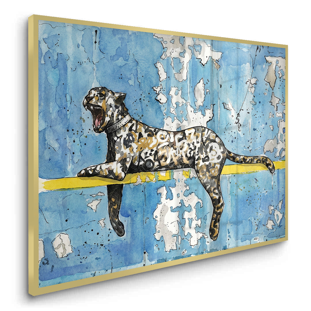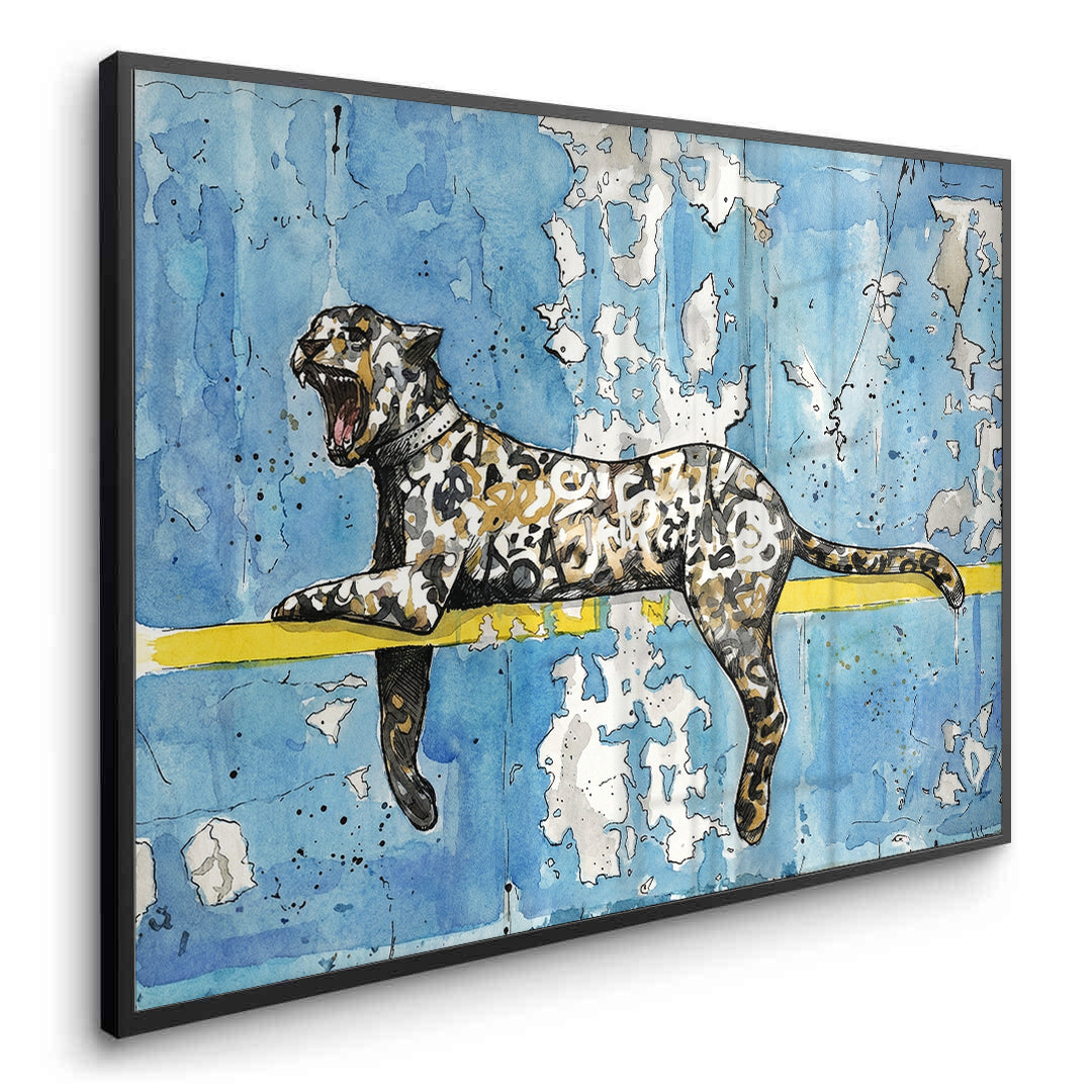 Embrace the raw energy of the wild with the Calligraphy Leopard from Jasmine Art’s Banksy series. This unique print features a roaring leopard adorned with intricate calligraphic scripts, set against a distressed blue watercolor backdrop. The striking yellow accent and urban street-art vibe make it a powerful focal point for any modern space. Finished with our signature premium vertical texture, this artwork offers exceptional tactile depth and a high-end gallery finish. A bold statement piece for a contemporary lounge, a creative office, or a luxury bedroom in Dubai.