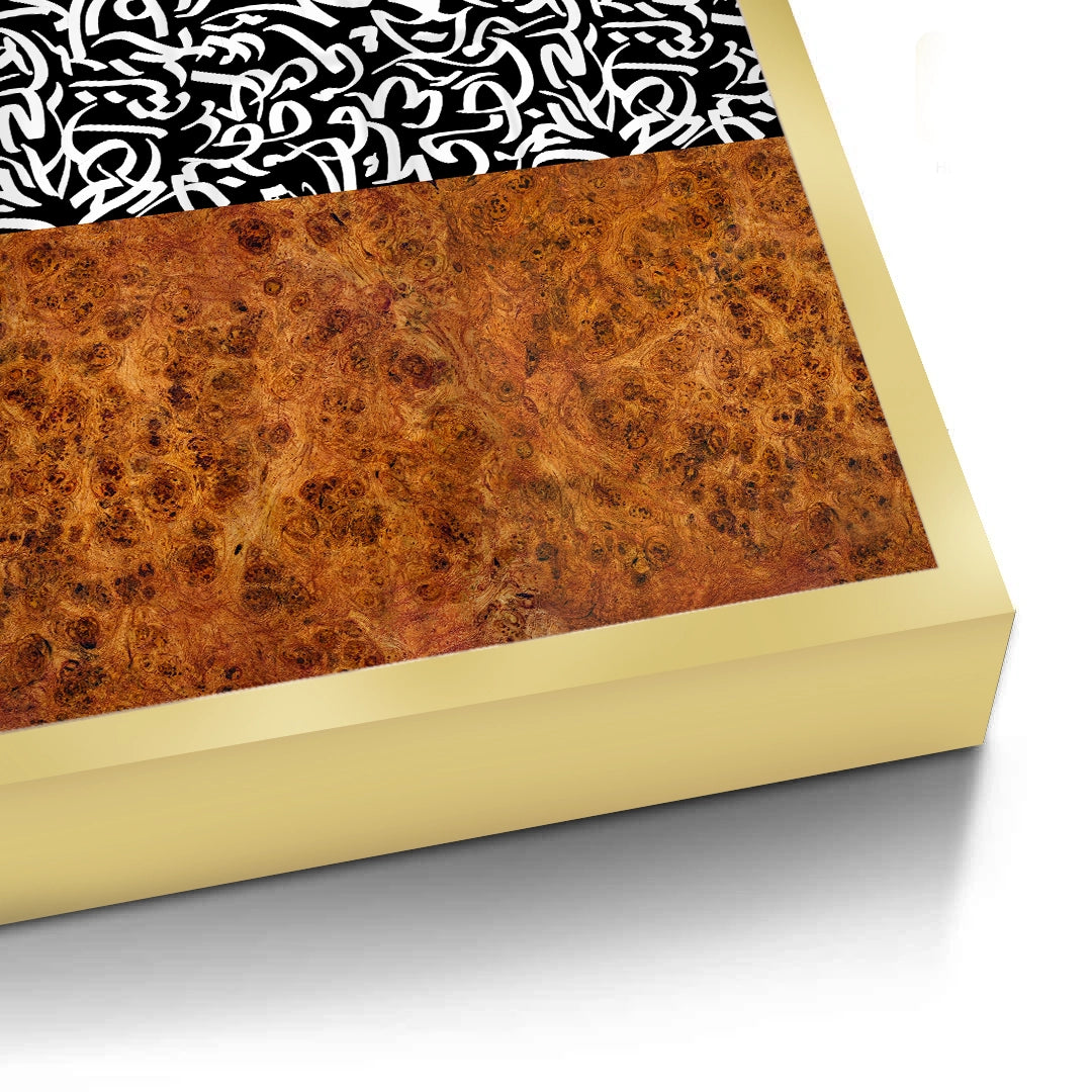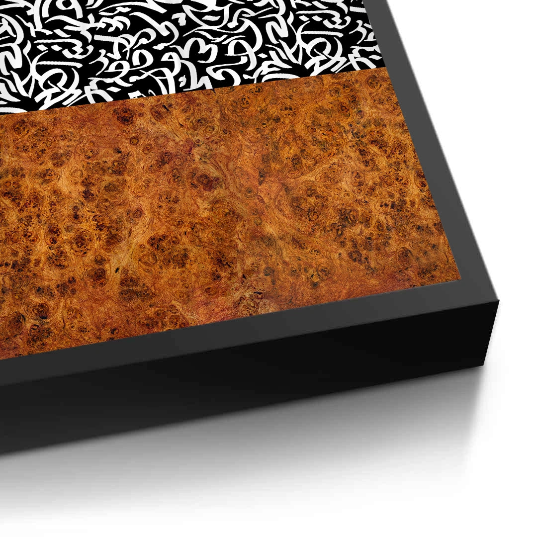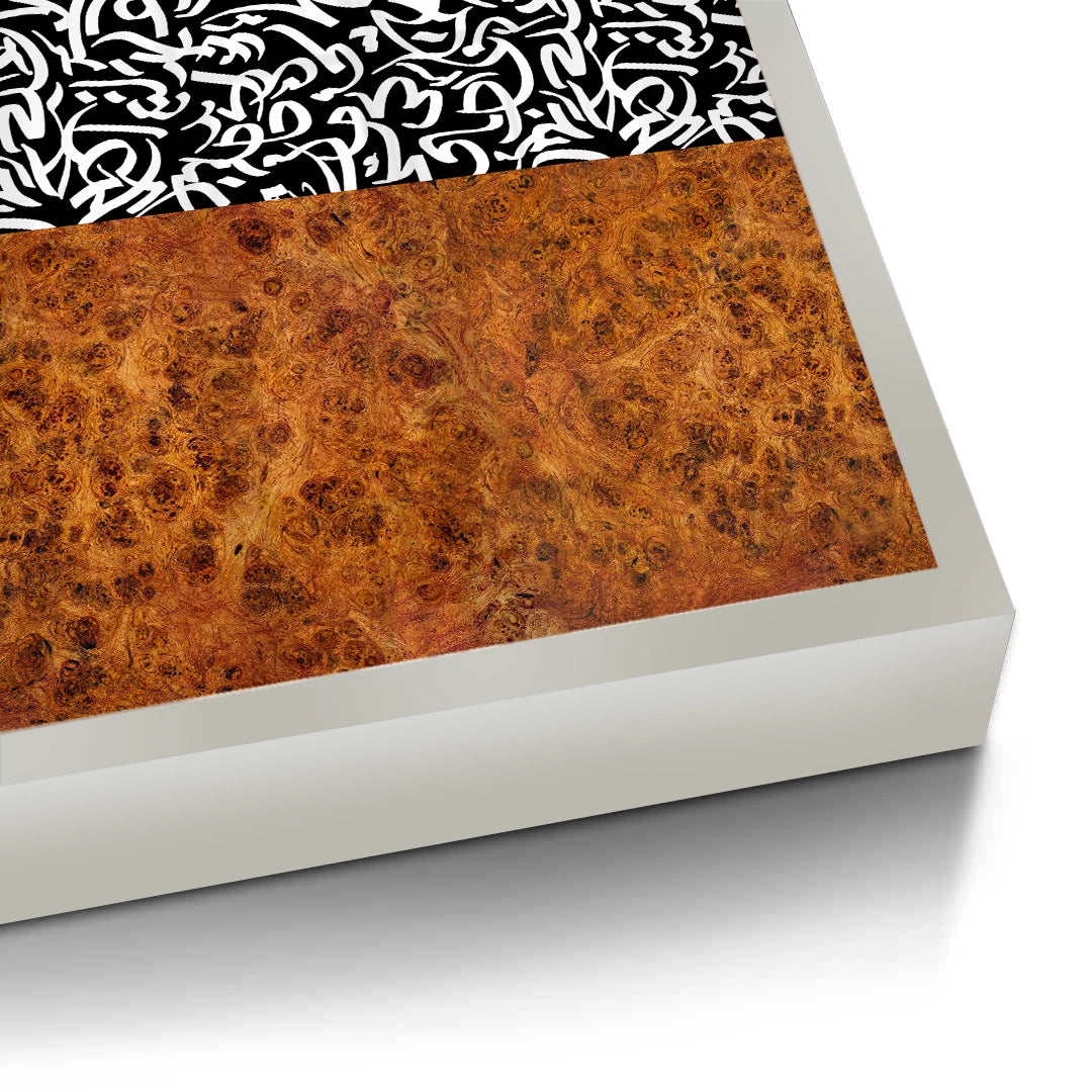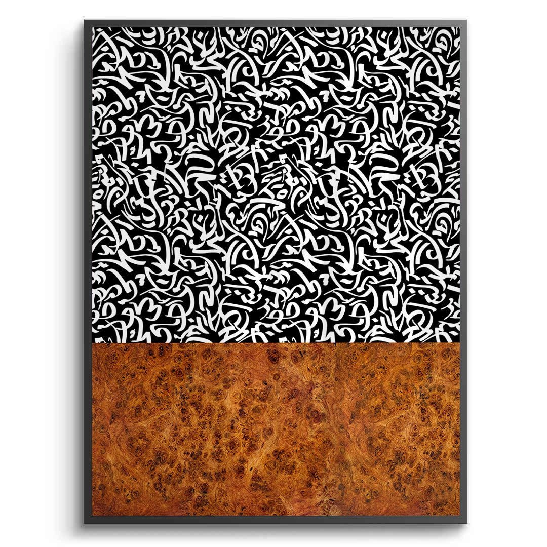 The sophisticated Calligraphy Pattern - Wood Texture Fusion print is a stunning contemporary piece that blends cultural script with natural elements. The artwork is divided into two contrasting halves: the upper portion features a dynamic, abstract black and white pattern of Arabic calligraphy, while the lower section grounds the piece with a rich, warm burl wood texture. This high-contrast fusion creates a unique and dramatic visual statement. Perfect for adding a modern, architectural, and luxurious artistic touch to any living room or office in Dubai.