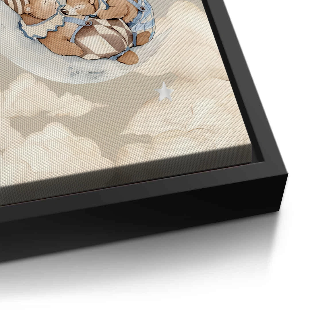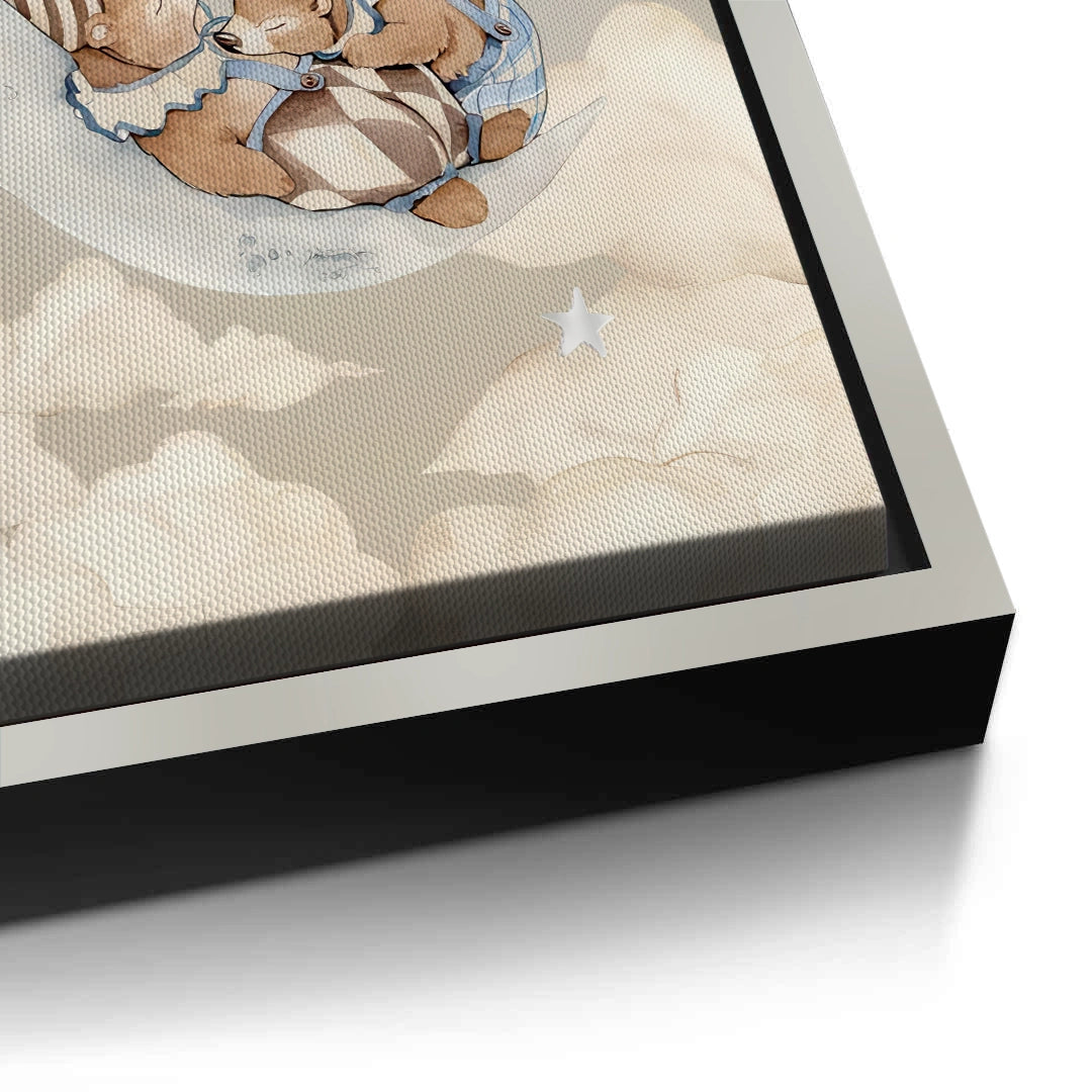 The magical Celestial Bear print depicts a sleepy bear floating among stars and moons in a deep, peaceful night sky. Rendered in calming blues and glowing gold accents, this artwork creates a serene and dreamy atmosphere for bedtime stories.