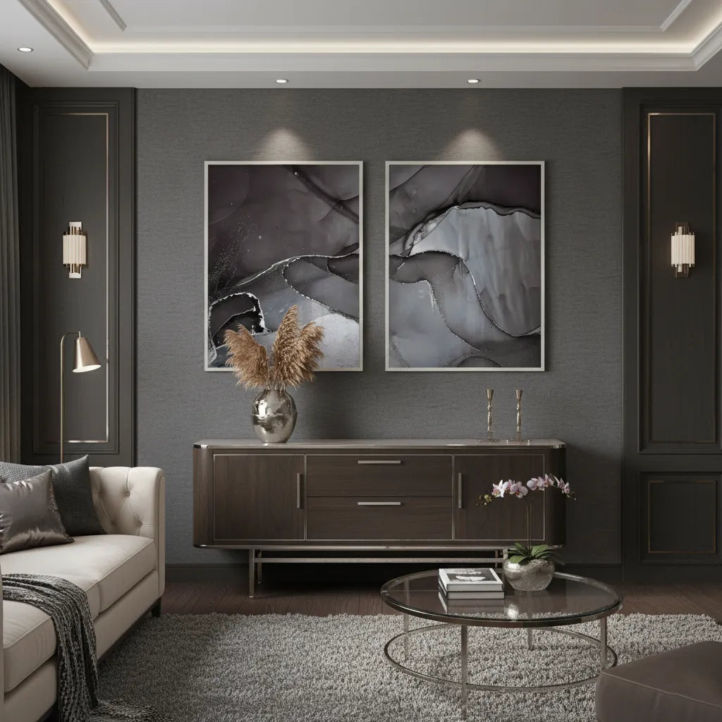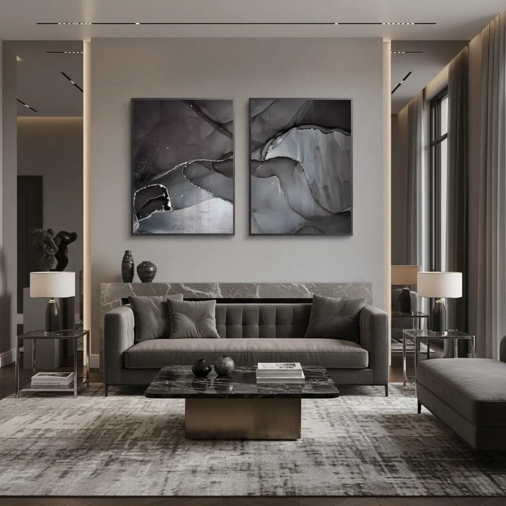 A powerful two-piece set defined by its deep charcoal tones and dynamic, fluid movement. This piece provides significant texture and visual depth, making it a fantastic choice for anchoring a contemporary living space or gallery wall with sophisticated weight and tone.