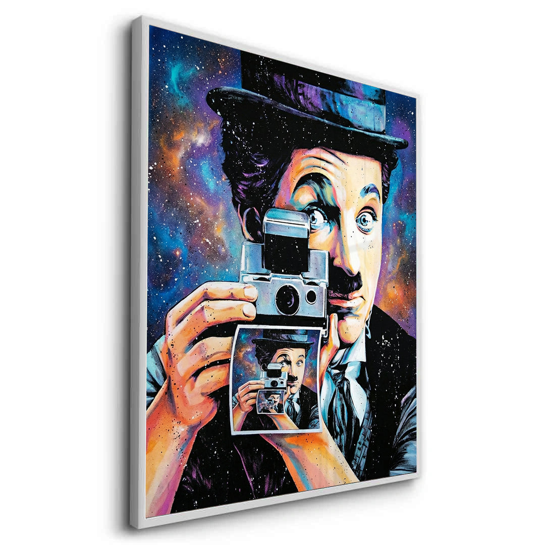 Step into a world of cinematic wonder with the Charlie Chaplin Cosmic art print from Jasmine Art. This vibrant masterpiece reimagines the legend of silent film in a surreal galaxy setting, capturing him in a recursive "infinite loop" as he snaps a photo. Featuring an explosion of neon purples, blues, and oranges, this piece brings a bold pop-art energy to any space. Finished with our signature premium vertical texture, it offers a high-end tactile finish that elevates this creative portrait into a gallery-standard treasure. A perfect focal point for a home theater, creative studio, or modern lounge in Dubai.