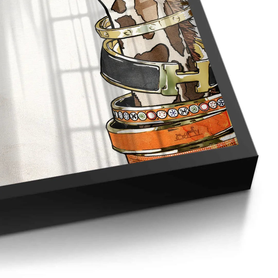 This witty piece features a chic giraffe accessorized with bold gold bracelets, blending wildlife photography with contemporary fashion. It's the perfect statement art for adding playful luxury and a surprising touch of humor to a modern living room or boutique space.