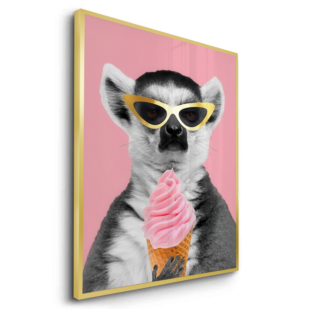 The effortlessly chic Cool Lemur with Ice Cream print is a striking piece of Pop Art luxury for any modern child's room or trendy office. This canvas features a black and white lemur adorned with sleek metallic gold sunglasses, holding a vibrant pink ice cream cone. It's a humorous, high-fashion statement that adds bold color and unique personality to your contemporary Dubai interior.
