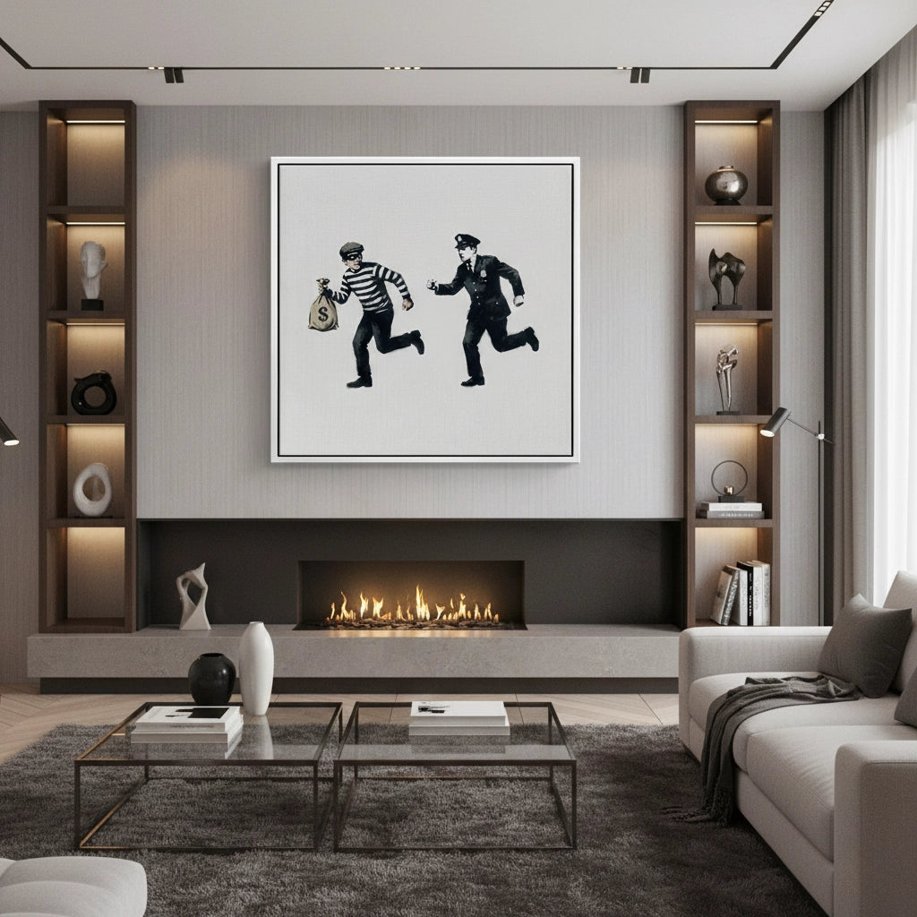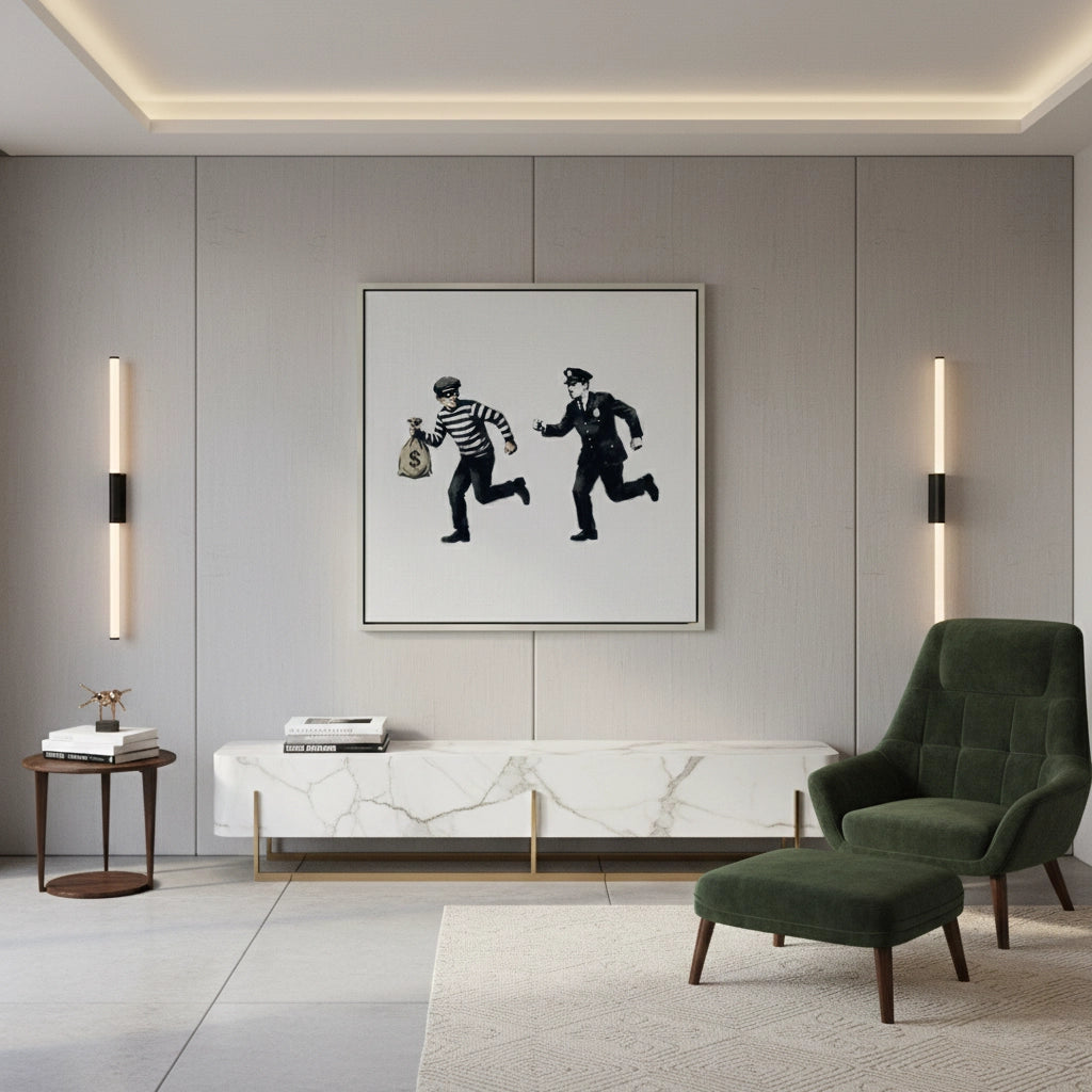 Bring the raw energy of urban street art into your home with Cops and Robbers from Jasmine Art’s Banksy series. This iconic stencil-style print captures a dynamic chase scene in a bold monochromatic palette, offering a satirical yet stylish take on modern street culture. Its minimalist composition and sharp contrast make it a powerful focal point for any contemporary interior. Finished with our signature premium vertical texture, this artwork provides exceptional tactile depth and a high-end gallery finish. A perfect statement piece for a modern lounge, a creative studio, or an edgy office in Dubai.
