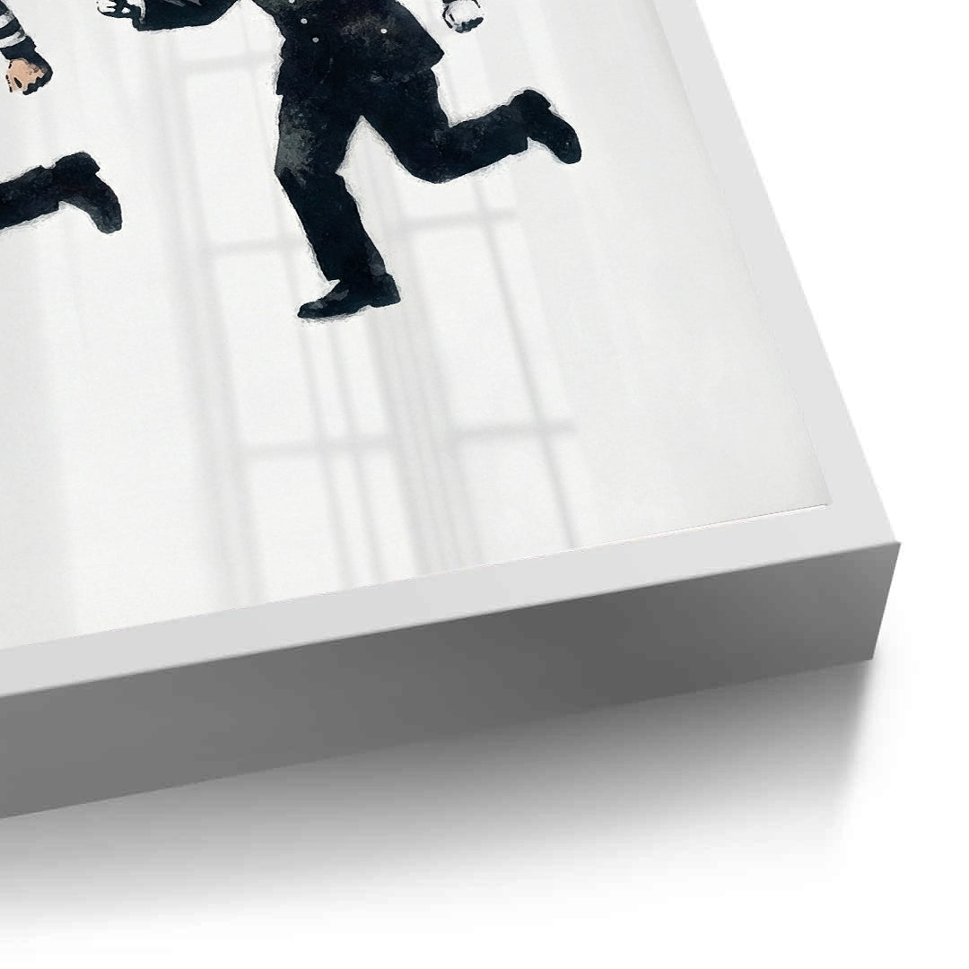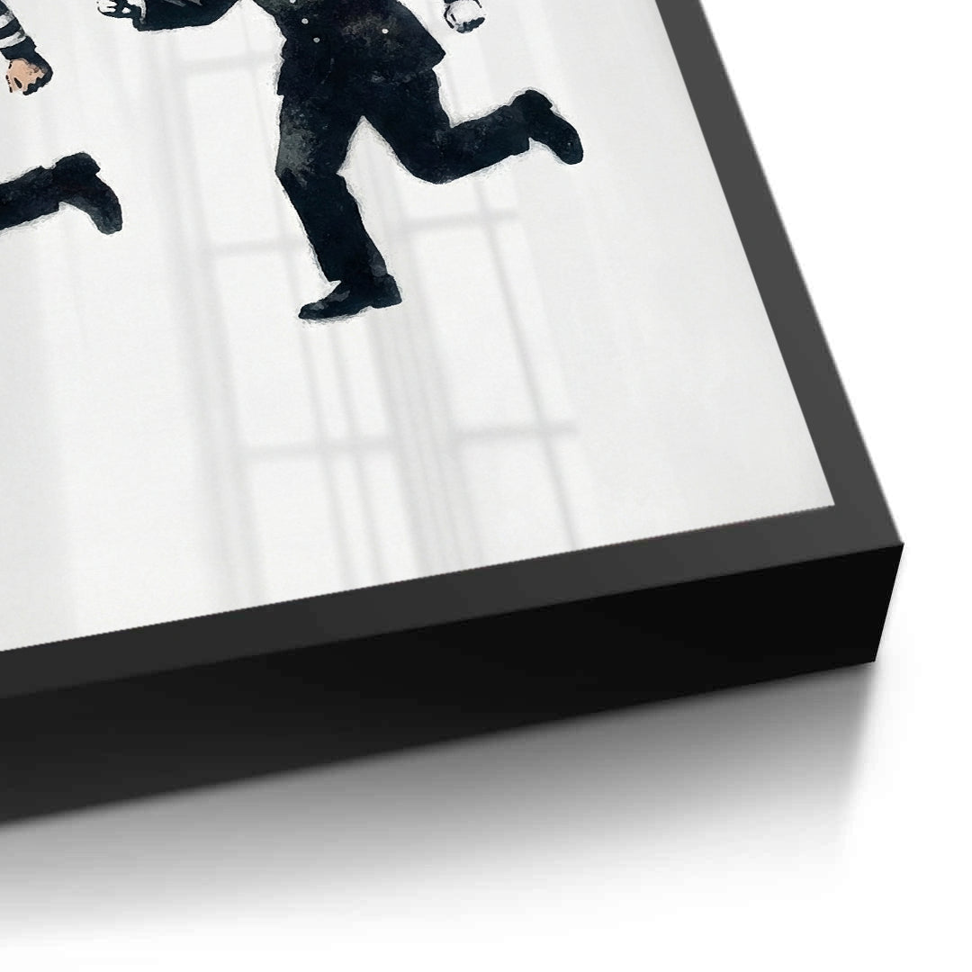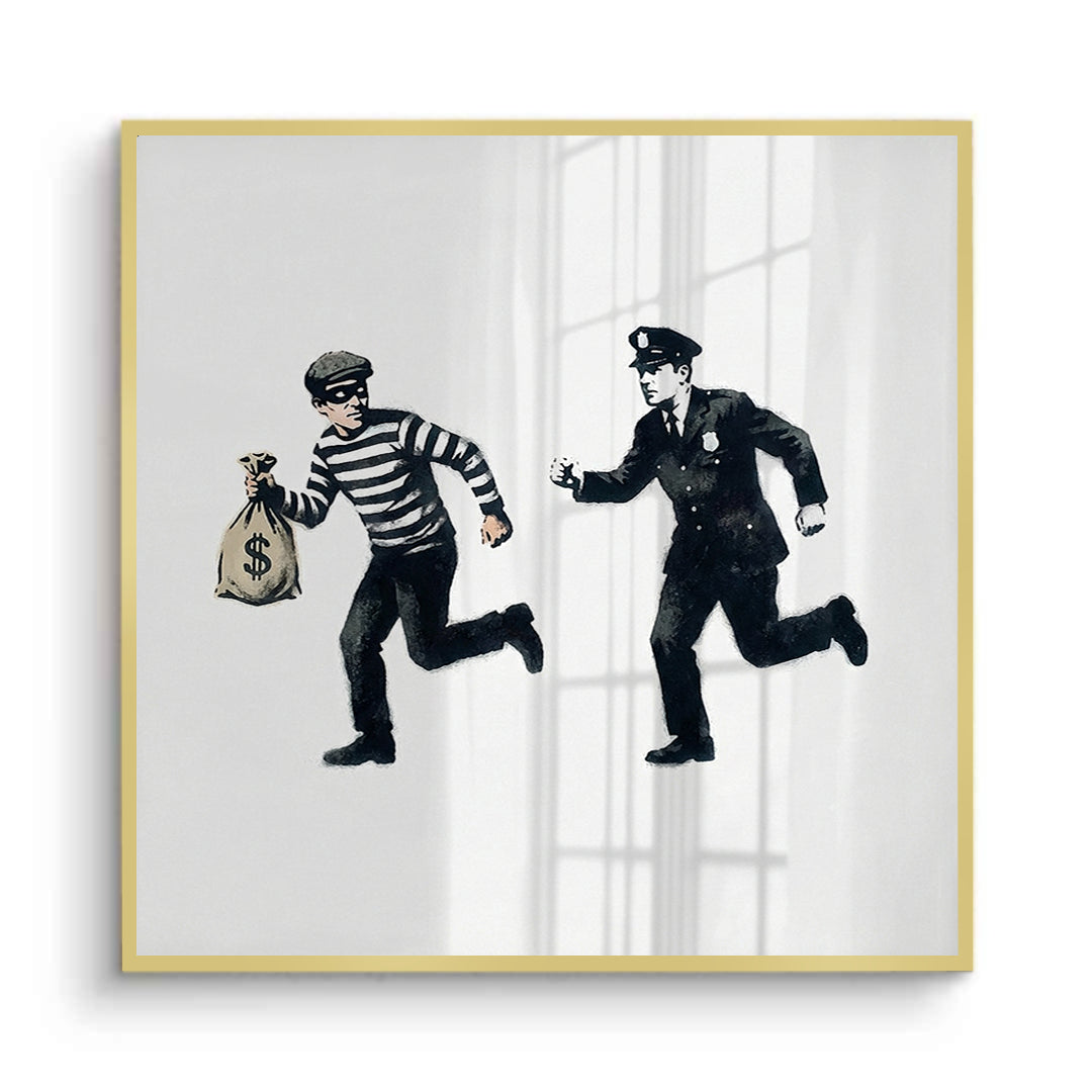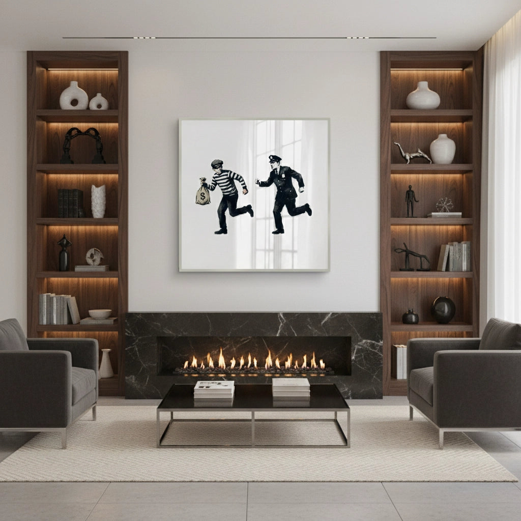 Bring the raw energy of urban street art into your home with Cops and Robbers from Jasmine Art’s Banksy series. This iconic stencil-style print captures a dynamic chase scene in a bold monochromatic palette, offering a satirical yet stylish take on modern street culture. Its minimalist composition and sharp contrast make it a powerful focal point for any contemporary interior. Finished with our signature premium vertical texture, this artwork provides exceptional tactile depth and a high-end gallery finish. A perfect statement piece for a modern lounge, a creative studio, or an edgy office in Dubai.