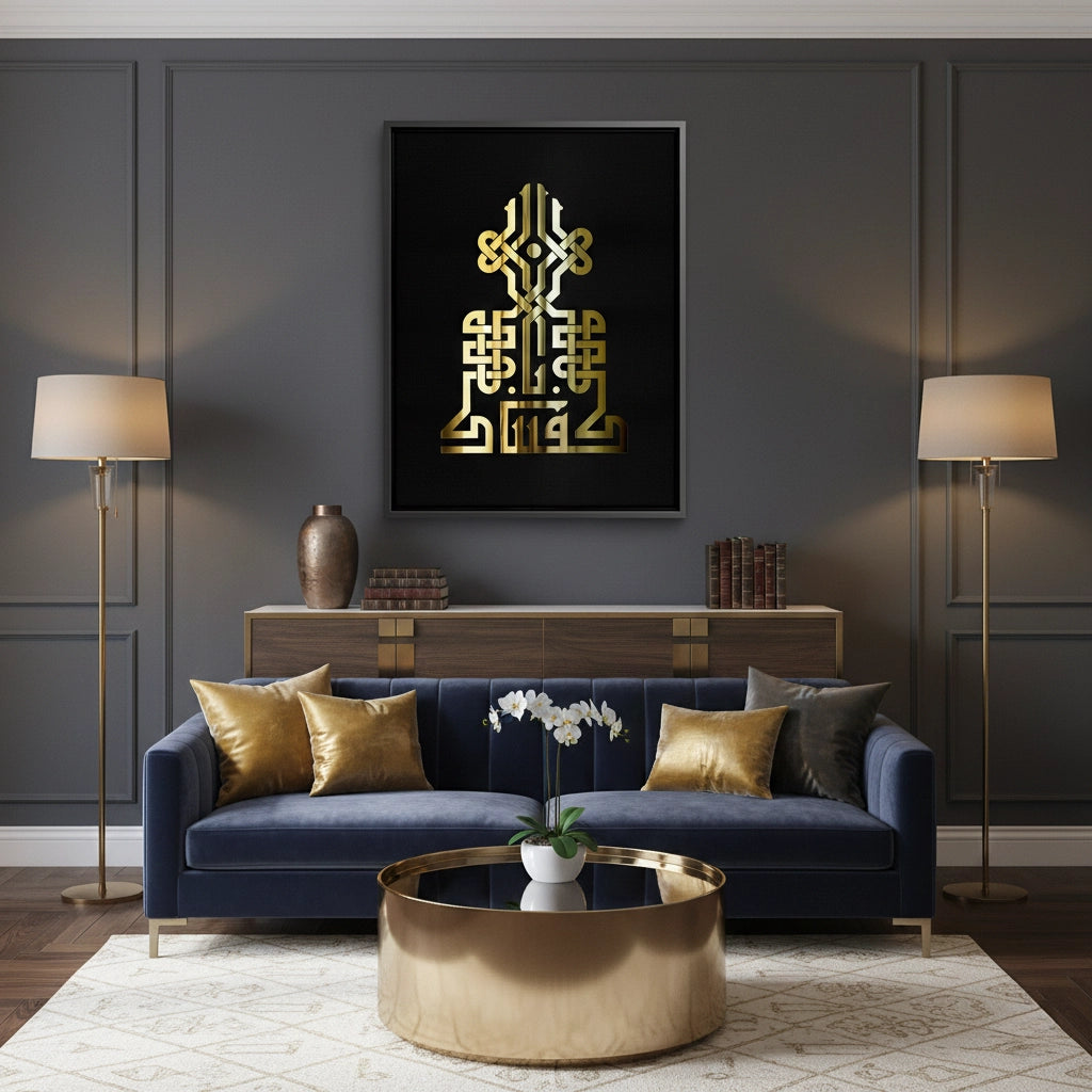Elevate your space with the spirit of gratitude through Grateful Majesty from Jasmine Art’s Arabic Calligraphy collection. This striking vertical piece combines a flowing golden Bismillah in Thuluth script with a bold, structured Square Kufic rendering of "Al-Hamdulillah". The deep obsidian background and shimmering gold accents create a powerful visual statement of faith and refinement. Finished with our signature premium matte-grain texture, this print offers exceptional tactile depth and a high-end gallery finish. A prestigious centerpiece for an executive office, a formal Majlis, or a luxury hallway in Dubai.