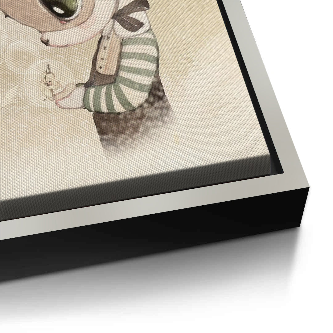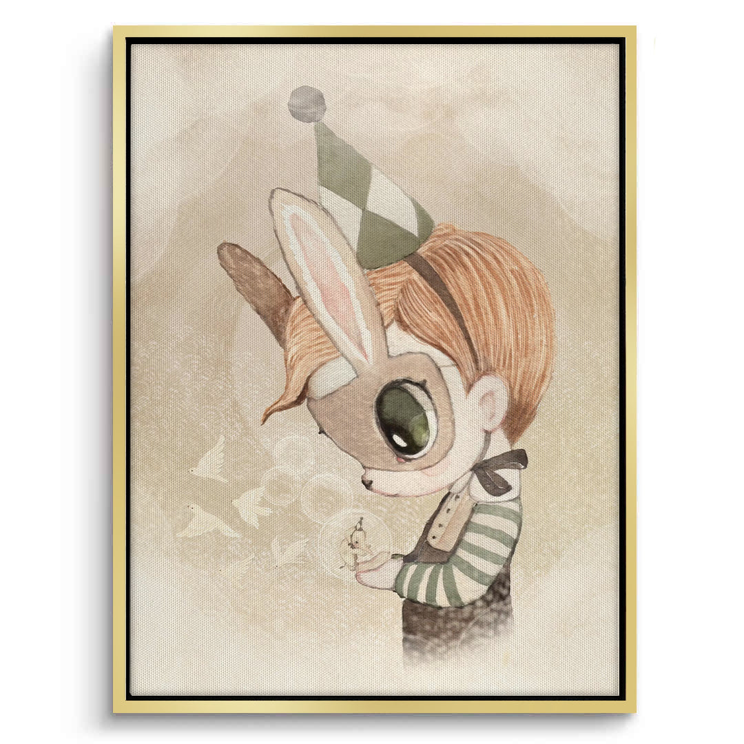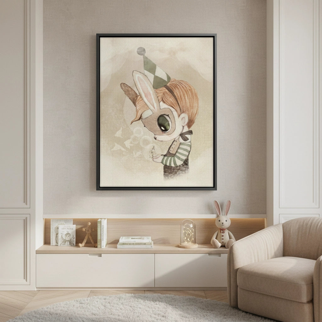 The absolutely enchanting Cute Child in Rabbit Costume print captures a moment of gentle wonder and imaginative play. This delicate watercolor illustration features a sweet, doll-like child wearing a charming bunny mask and harlequin party hat. The child is holding a small glowing jar, symbolizing curiosity and magic. Set against a soft, dreamy, neutral background, this piece is perfect for adding a tender, imaginative, and sophisticated character charm to a nursery or child's bedroom in Dubai.