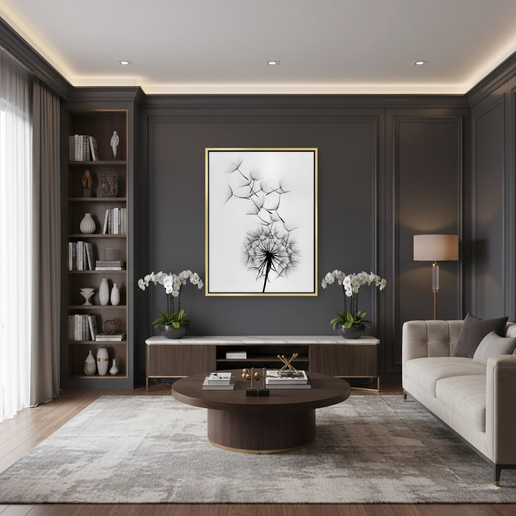 The elegant Dandelion Fluff print captures the ephemeral beauty and symbolism of the dandelion. This striking monochrome line art features a large, detailed dandelion seed head with its delicate seeds scattering into the wind. Set against a stark white background, the artwork provides a clean, minimalist, and highly textural visual. It is a perfect piece for adding natural sophistication, calm, and a subtle sense of whimsy to any modern, light-filled interior in Dubai.