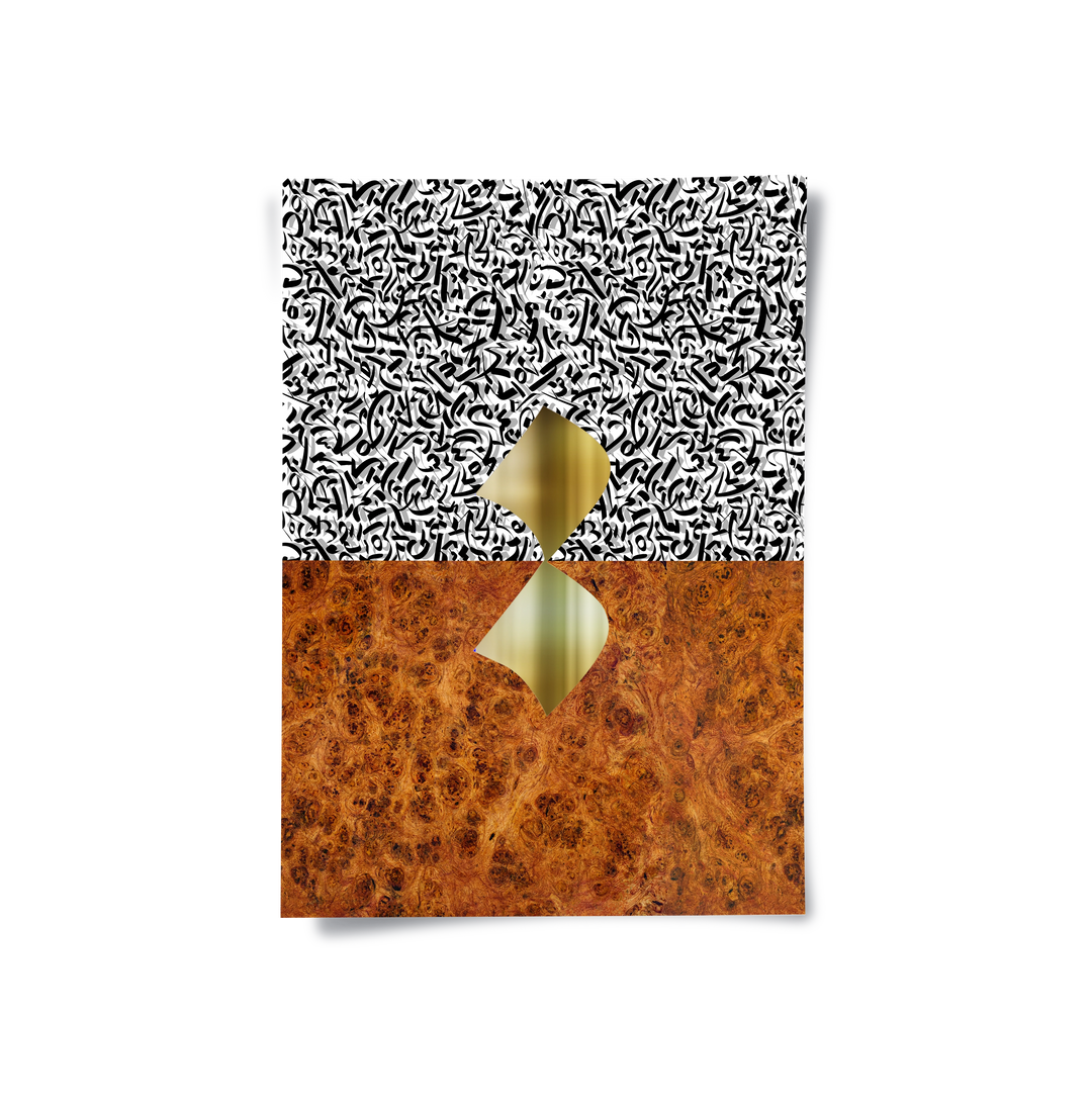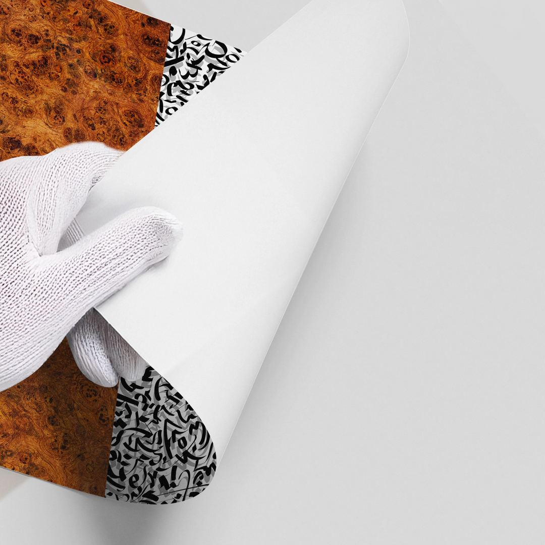 The impactful Dichotomy Series - Abstract Script & Burl Wood print is a masterful study in contrast and texture. The piece is starkly divided into two halves: the upper section pulsates with dense, energetic black and white abstract Arabic script, while the lower section provides stability with a luxurious, rich brown Burl Wood grain texture. This juxtaposition of dynamic script and natural luxury creates a uniquely modern and sophisticated statement. Ideal for adding a bold, textural, and visually fascinating accent to an executive office or contemporary living room in Dubai.