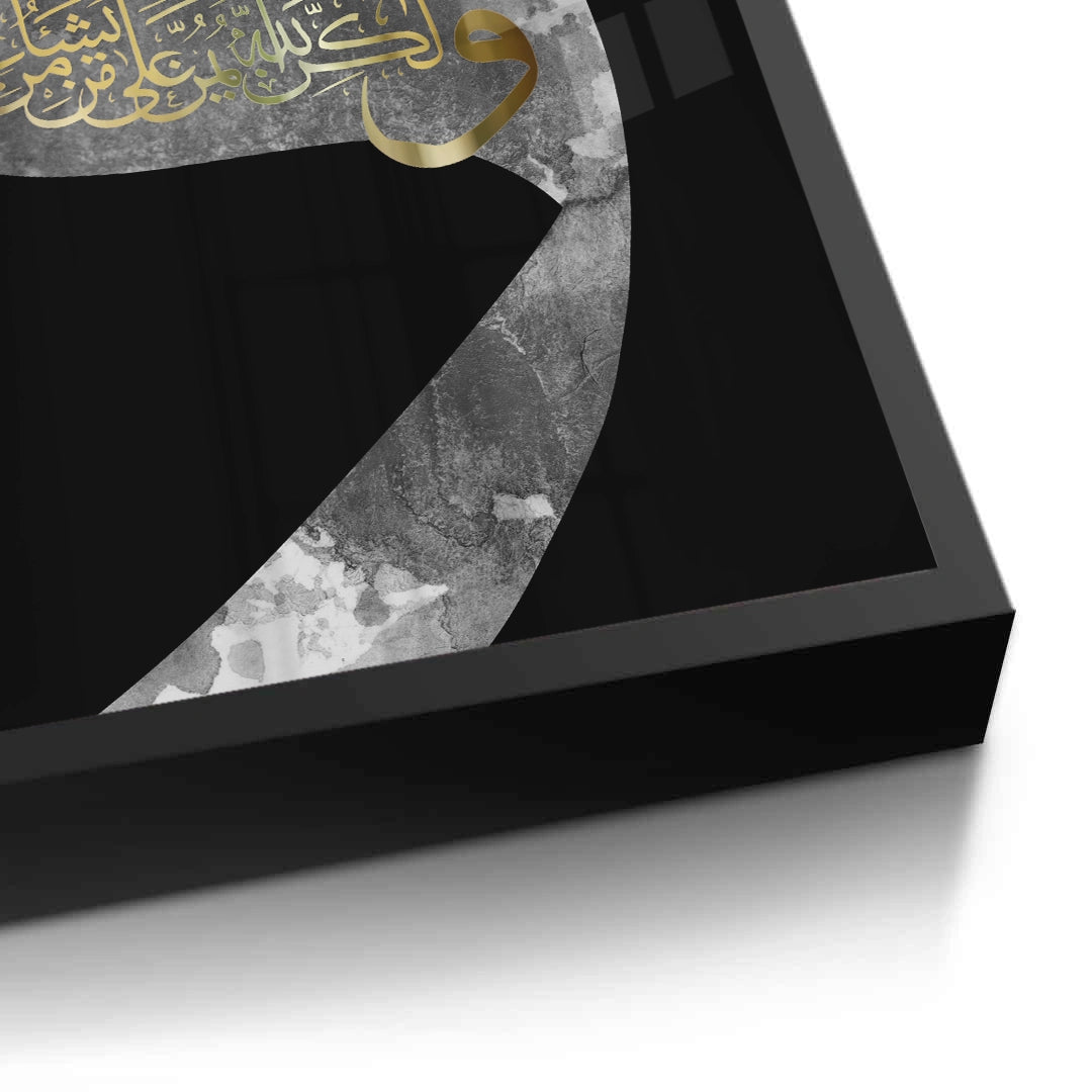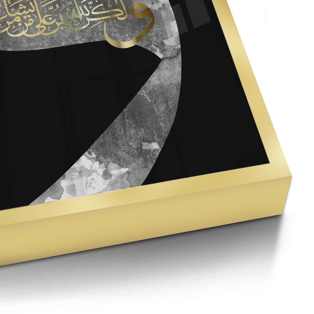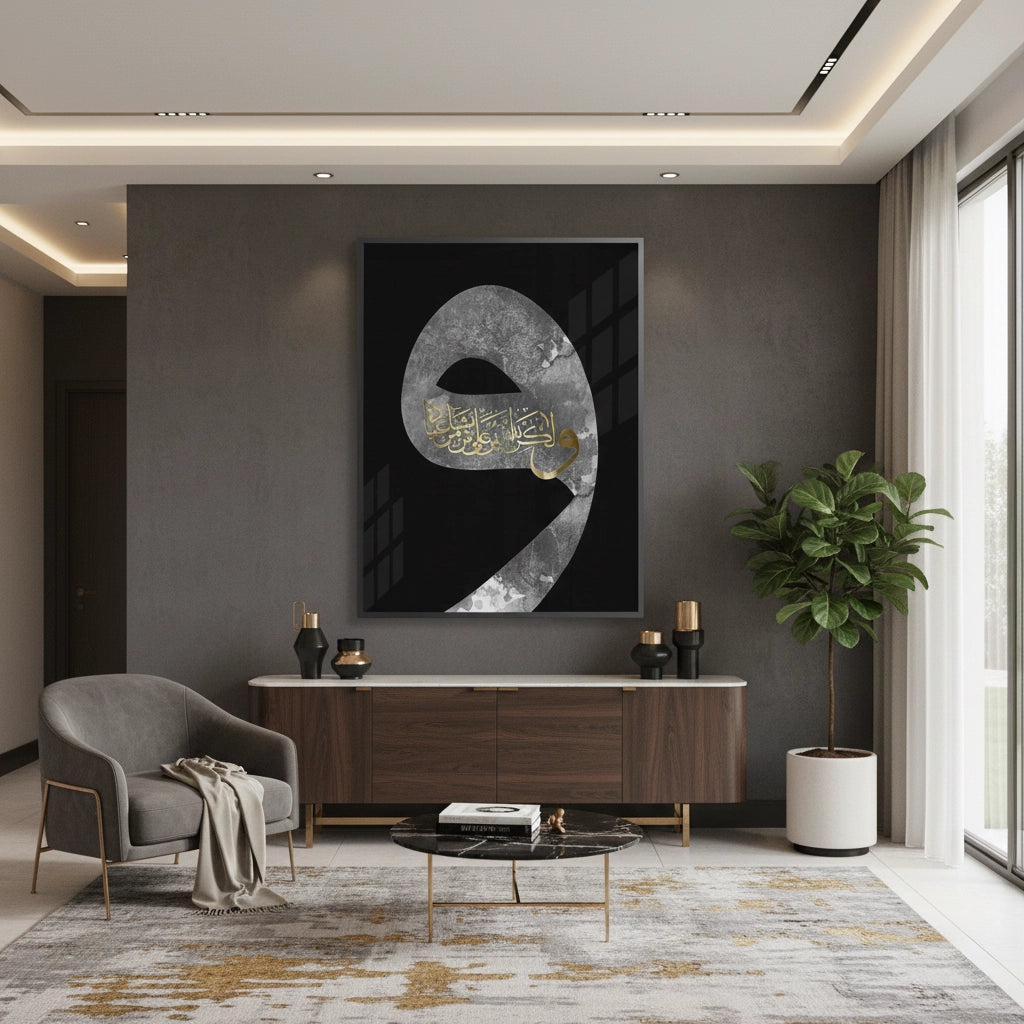 The profound Divine Protection - Waaw Calligraphy in Gold print is a striking piece that combines modern design with deep spiritual meaning. The artwork features the majestic Arabic letter 'Waaw' in a bold, oversized form with a sophisticated grey marble texture against a dramatic black background. Within the curve of the letter, an intricate religious phrase is rendered in stunning metallic gold foil. This piece is perfect for adding a modern, elegant, and deeply meaningful spiritual accent to any sophisticated living space or prayer room in Dubai.