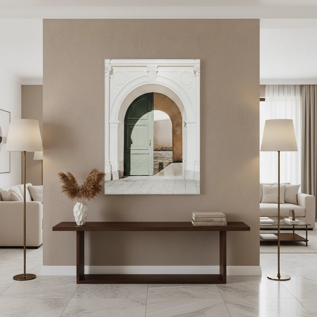 Step into a world of timeless beauty with the Doorway art print. This elegant architectural piece features a stunning classical archway framing a half-open sage green door, inviting the viewer into a sun-drenched, peaceful courtyard. The soft play of shadows against the creamy white facade creates a serene and sophisticated composition. Enhanced with our signature premium vertical texture, this print provides a high-end tactile finish that adds depth and character to any wall. It is an ideal choice for a calming entryway, a chic living room, or a boutique interior in Dubai.