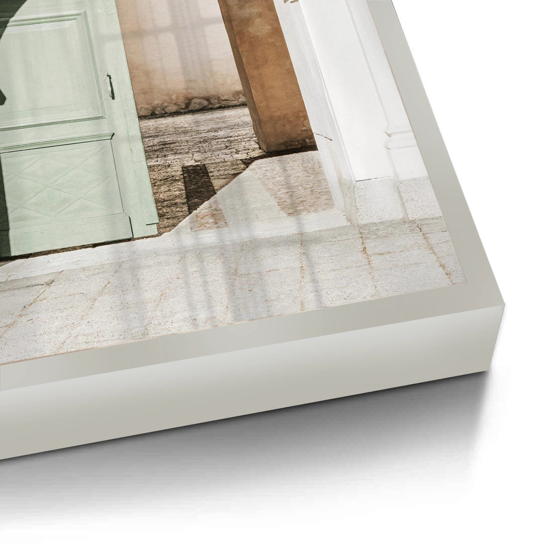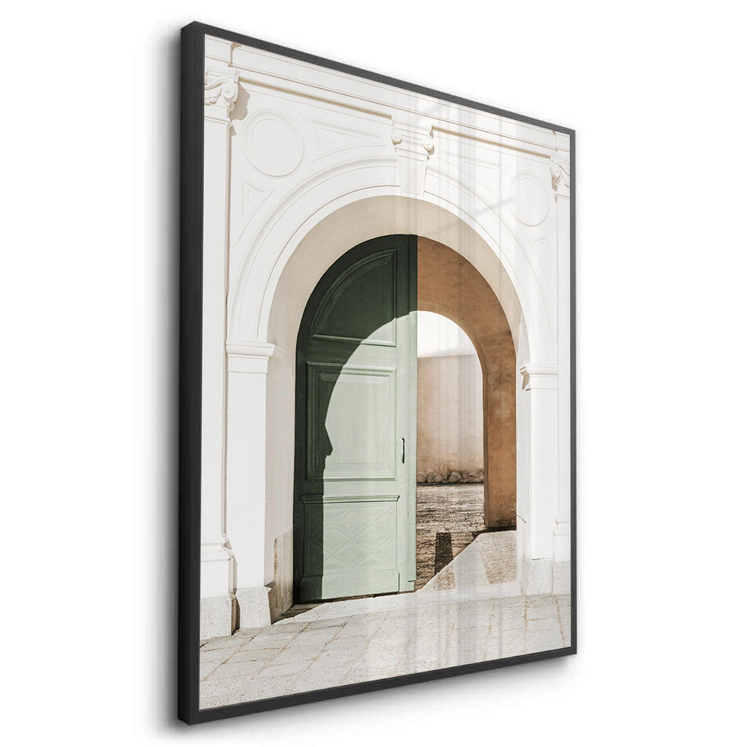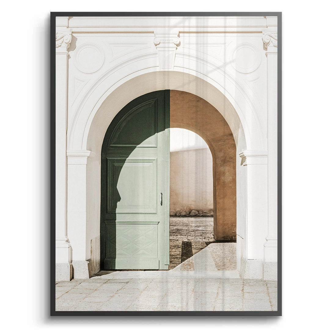 Step into a world of timeless beauty with the Doorway art print. This elegant architectural piece features a stunning classical archway framing a half-open sage green door, inviting the viewer into a sun-drenched, peaceful courtyard. The soft play of shadows against the creamy white facade creates a serene and sophisticated composition. Enhanced with our signature premium vertical texture, this print provides a high-end tactile finish that adds depth and character to any wall. It is an ideal choice for a calming entryway, a chic living room, or a boutique interior in Dubai.