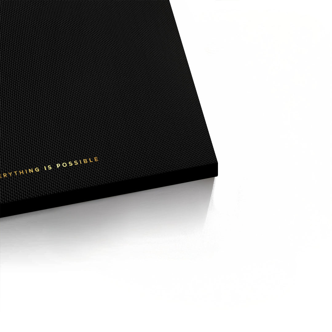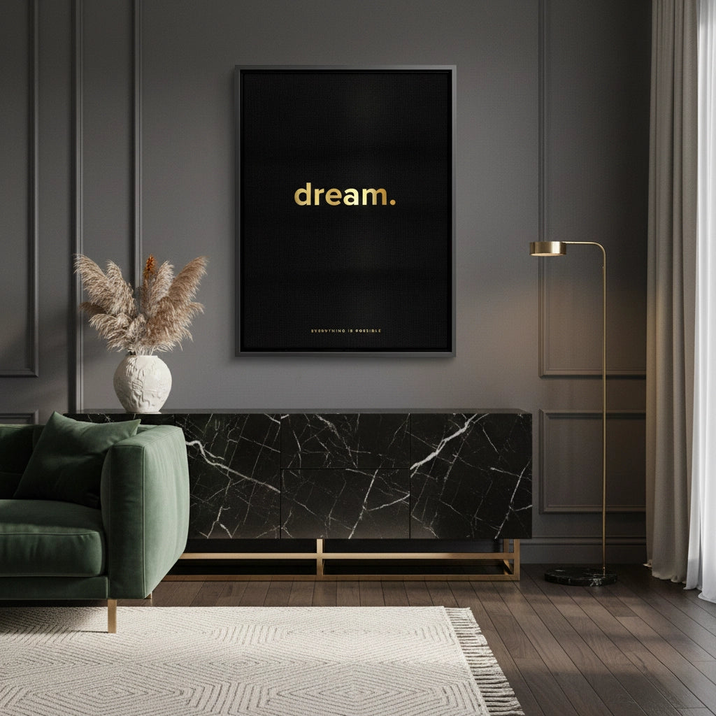 The ultra-minimalist Dream. - Minimalist Gold Typography print is a powerful focus on ambition and possibility. The central word "dream." is rendered in bold, lowercase metallic gold sans-serif typography, establishing a contemporary, clean aesthetic. The subtle but profound statement "EVERYTHING IS POSSIBLE" anchors the bottom of the piece. The striking metallic gold is dramatically set against a deep black canvas featuring vertical pinstripes, ensuring a sleek, high-end luxury finish. Ideal for a modern office, executive space, or sophisticated living area in Dubai.