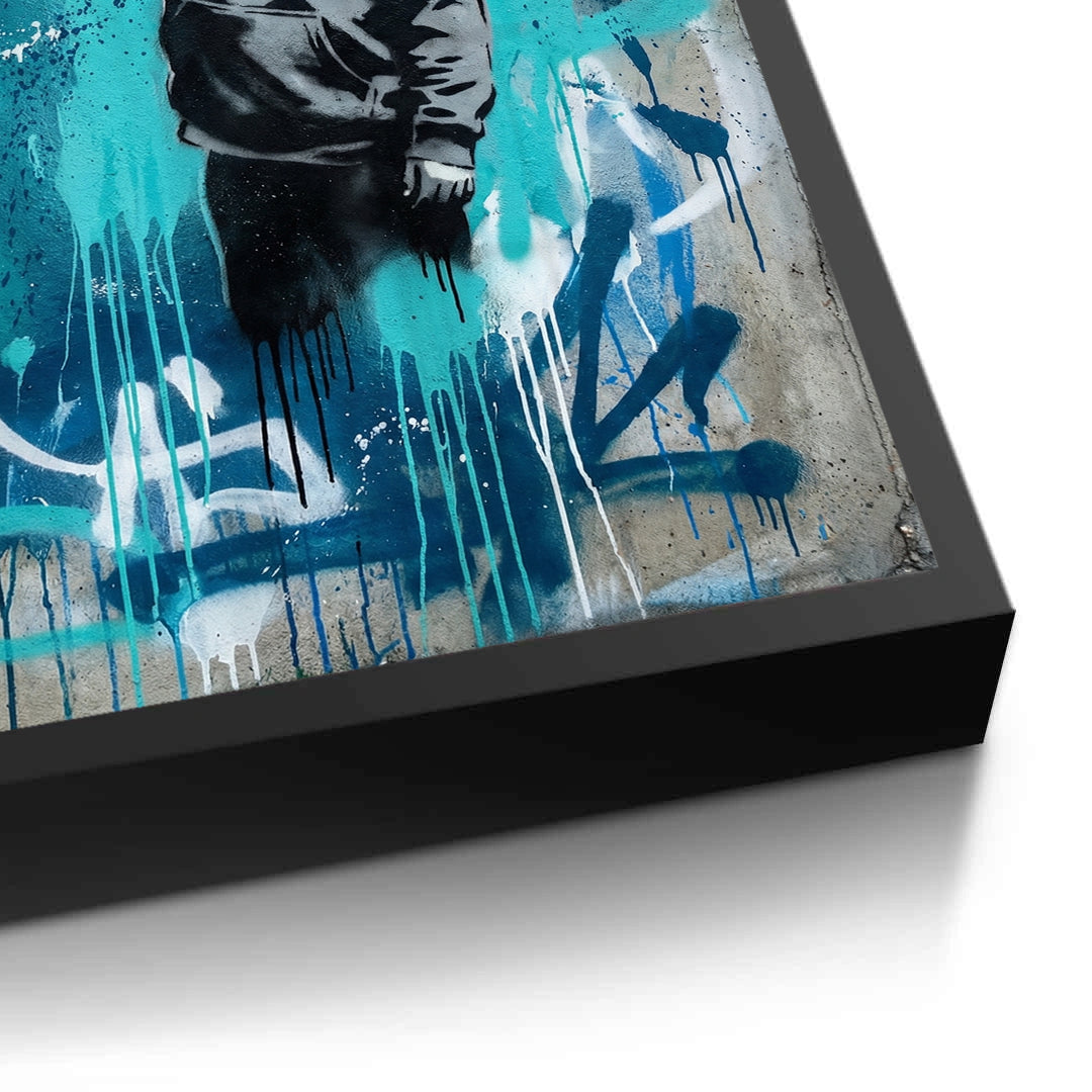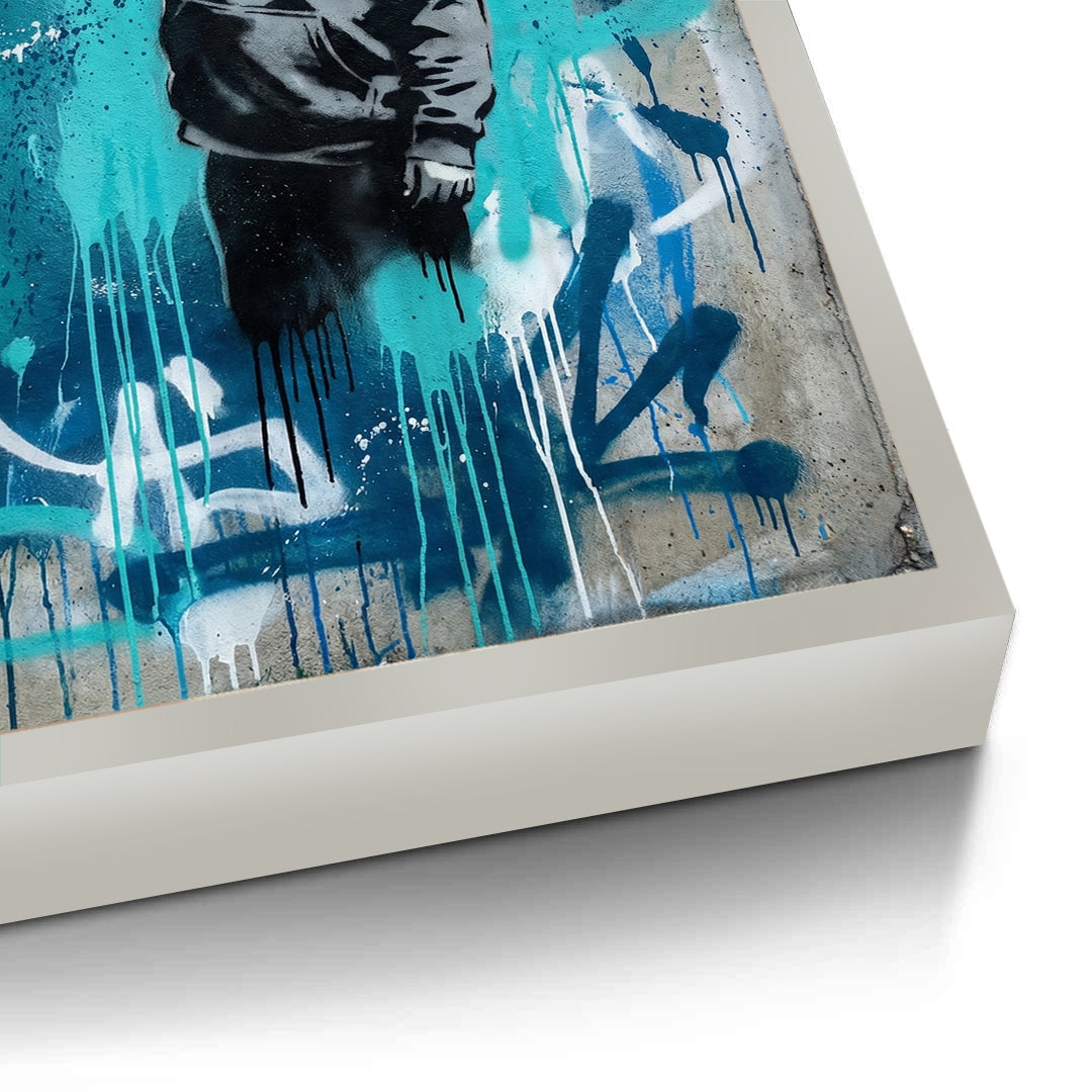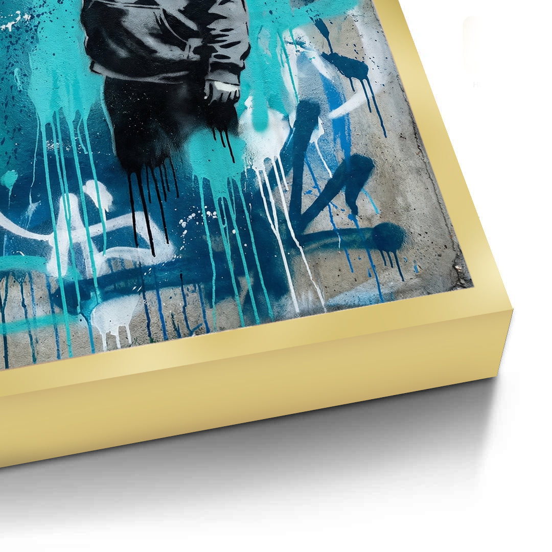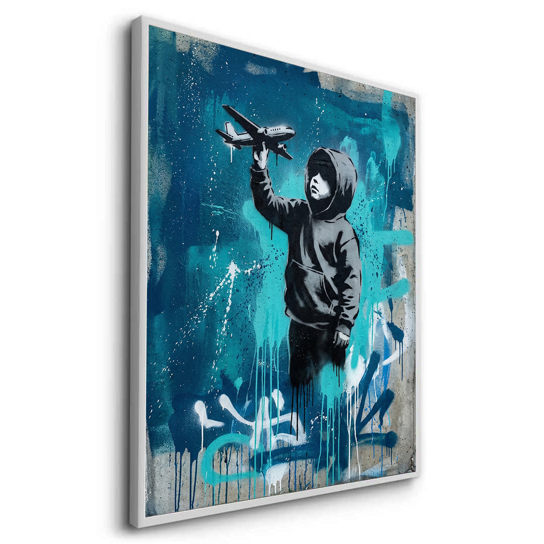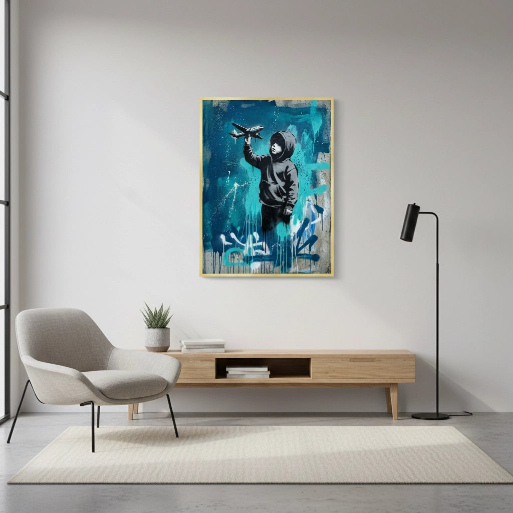 Let your imagination take off with the Dreams of Flight art print from Jasmine Art’s Banksy-inspired collection. This evocative piece features a monochromatic stencil of a child holding a toy airplane against a backdrop of vibrant teal and blue dripping graffiti. The contrast between the grounded figure and the sky-inspired colors symbolizes the limitlessness of a child’s dreams. Finished with our signature premium vertical texture, this print provides a luxurious tactile experience and gallery-quality depth. A perfect inspirational focal point for a modern nursery, creative studio, or a stylish contemporary home in Dubai.