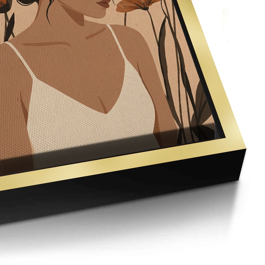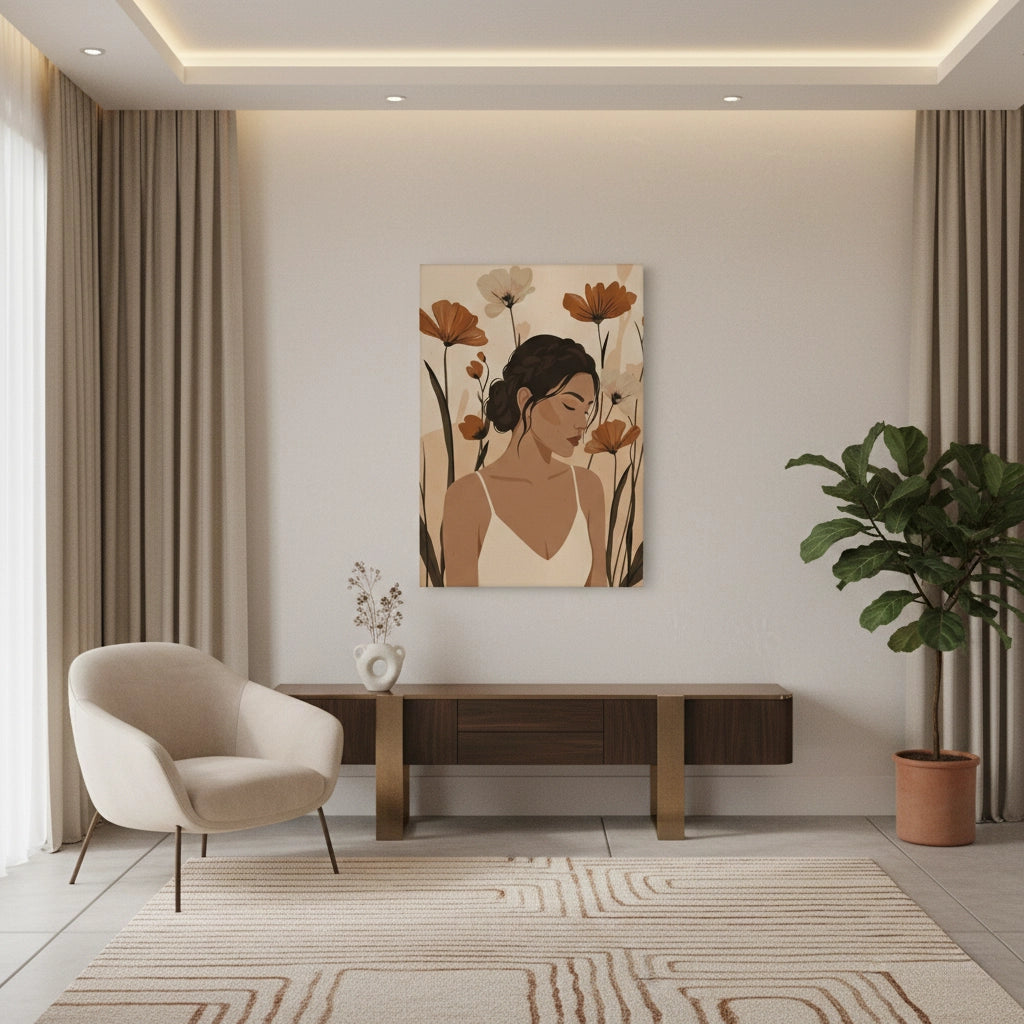 Infuse your home with gentle elegance with the Dreamy Floral Portrait from Jasmine Art’s Bohemian series. This stunning piece features a serene female portrait surrounded by blooming wildflowers in a warm palette of terracotta and cream. Its soft, organic aesthetic creates a tranquil and romantic focal point for any modern living space. Finished with our signature premium vertical texture, this print provides exceptional tactile depth and a high-end gallery finish. A perfect feminine statement piece for a luxury master bedroom, a cozy lounge, or a chic dressing area in Dubai.