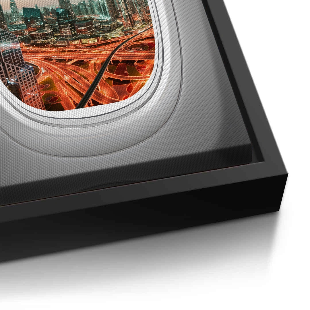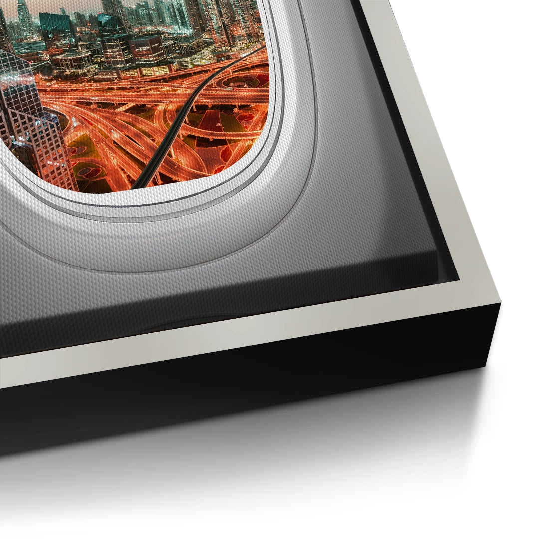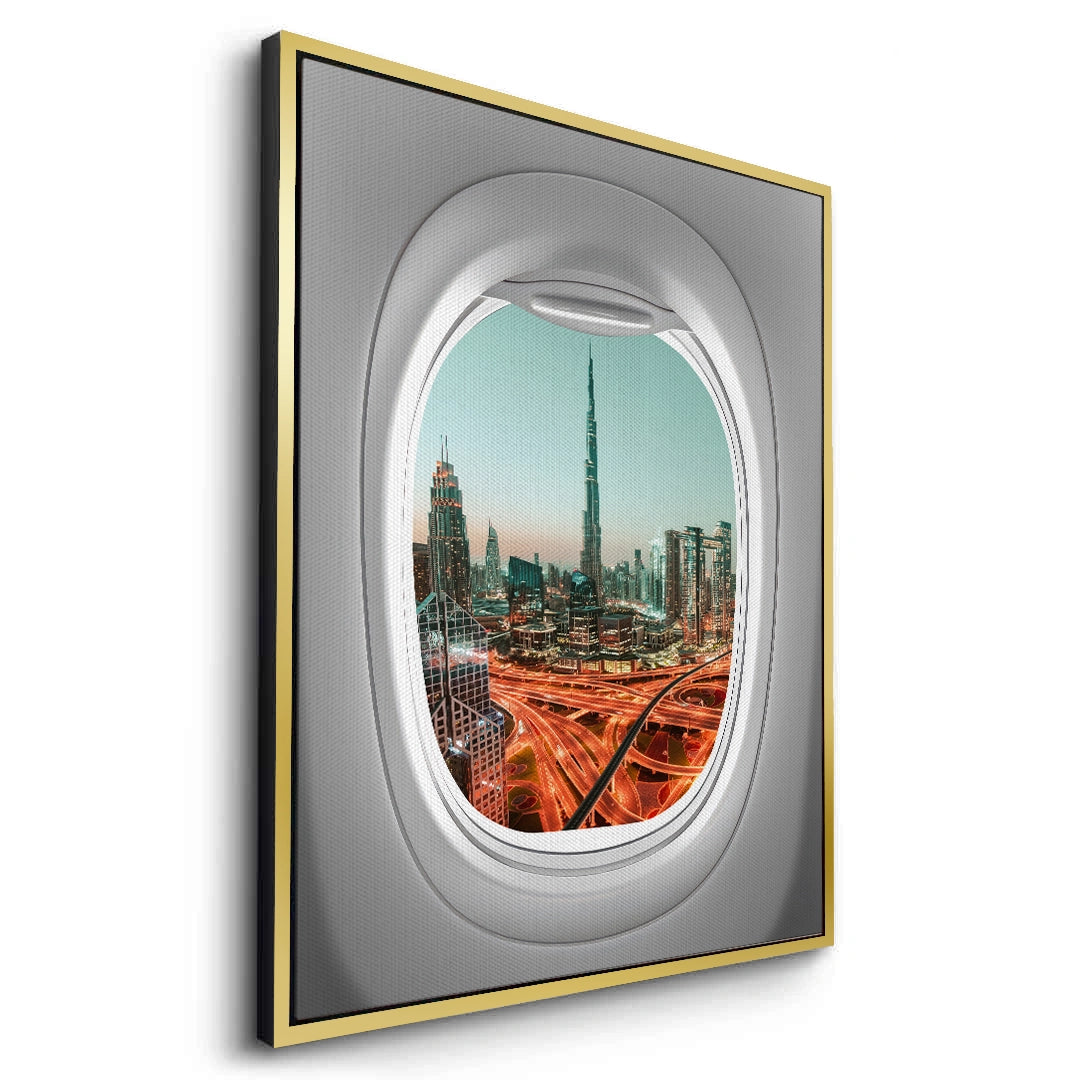 Capture the magic of arriving in the city of dreams with the Dubai View art print. This creative piece offers a breathtaking aerial perspective of the Burj Khalifa and Downtown Dubai, framed uniquely through an airplane window. The glowing city lights and winding highways create a vibrant contrast against the cool twilight sky. Finished with our signature premium vertical texture, this print adds a luxurious tactile finish that enhances the depth of the urban landscape. An inspiring statement piece for travel enthusiasts, modern lounges, or high-rise offices in Dubai.