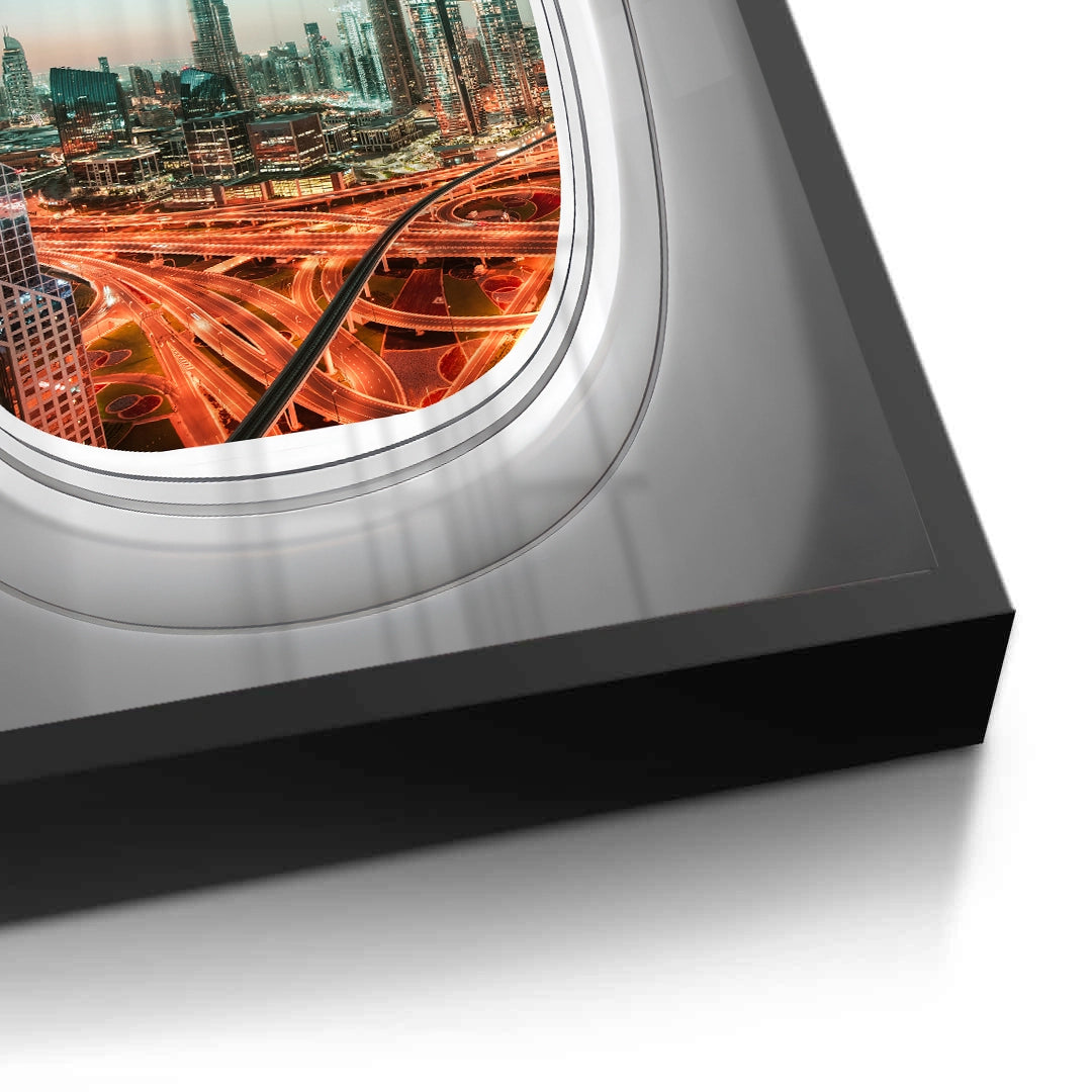 Capture the magic of arriving in the city of dreams with the Dubai View art print. This creative piece offers a breathtaking aerial perspective of the Burj Khalifa and Downtown Dubai, framed uniquely through an airplane window. The glowing city lights and winding highways create a vibrant contrast against the cool twilight sky. Finished with our signature premium vertical texture, this print adds a luxurious tactile finish that enhances the depth of the urban landscape. An inspiring statement piece for travel enthusiasts, modern lounges, or high-rise offices in Dubai.