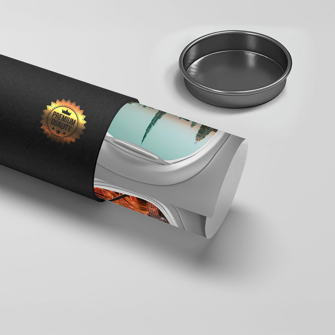 Capture the magic of arriving in the city of dreams with the Dubai View art print. This creative piece offers a breathtaking aerial perspective of the Burj Khalifa and Downtown Dubai, framed uniquely through an airplane window. The glowing city lights and winding highways create a vibrant contrast against the cool twilight sky. Finished with our signature premium vertical texture, this print adds a luxurious tactile finish that enhances the depth of the urban landscape. An inspiring statement piece for travel enthusiasts, modern lounges, or high-rise offices in Dubai.