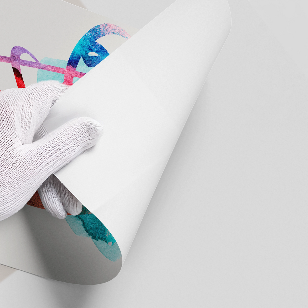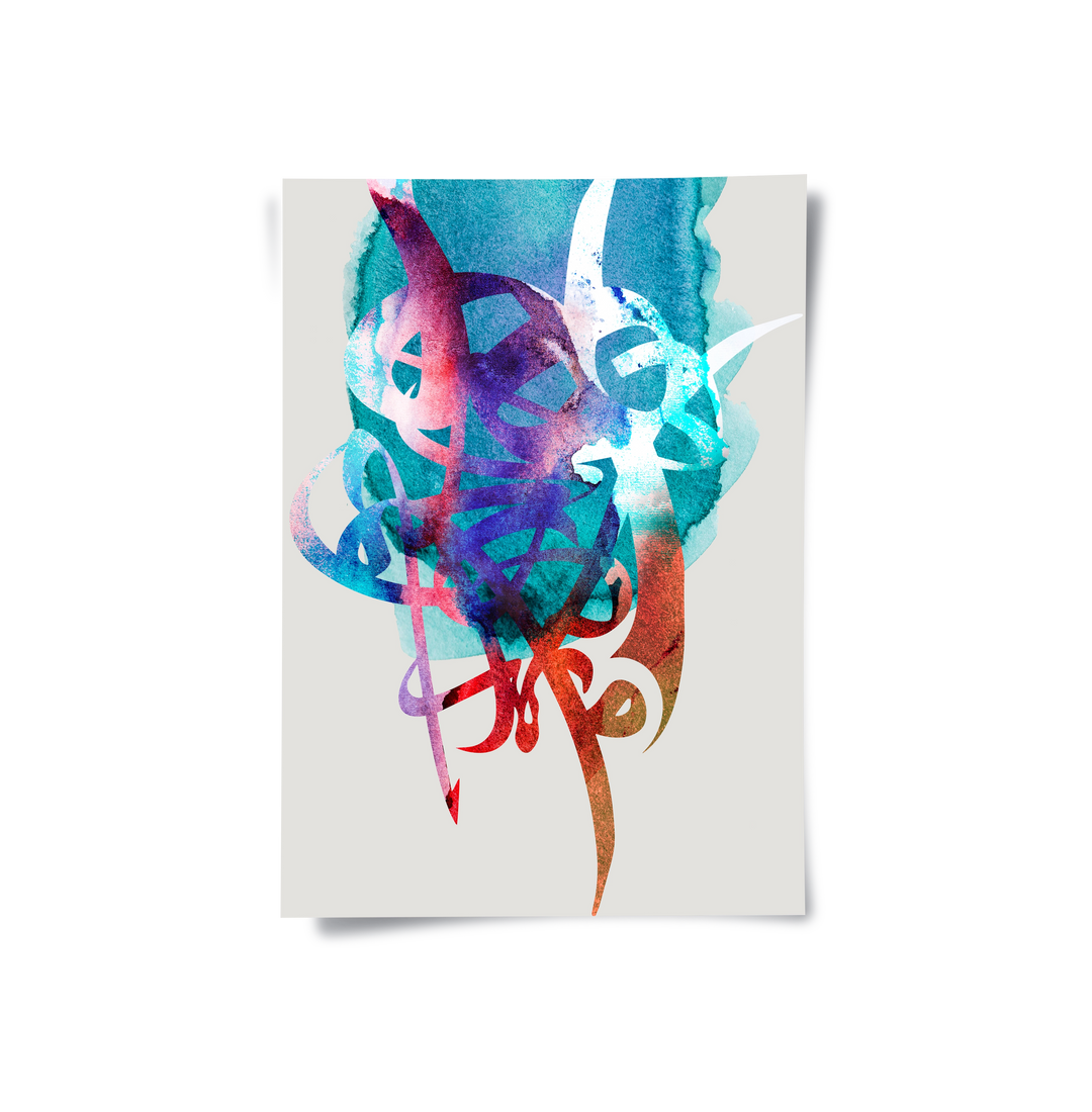 The stunning Dynamic Light - Abstract Calligraphy print is an explosion of colour and movement, perfectly embodying modern artistic expression. This highly energetic piece features fluid abstract washes in a striking palette of bold teal, magenta, and warm rust tones. Layered across this canvas are overlapping, expressive Arabic script elements, creating a sense of depth and spiritual motion. It is an ideal statement piece to add a vibrant, contemporary, and culturally artistic focus to a living space or studio in Dubai.