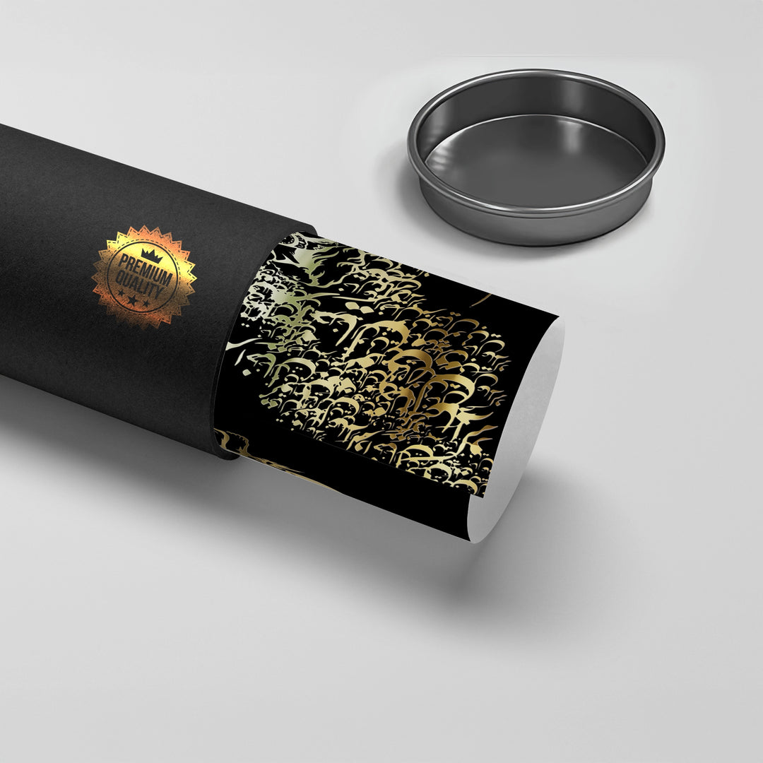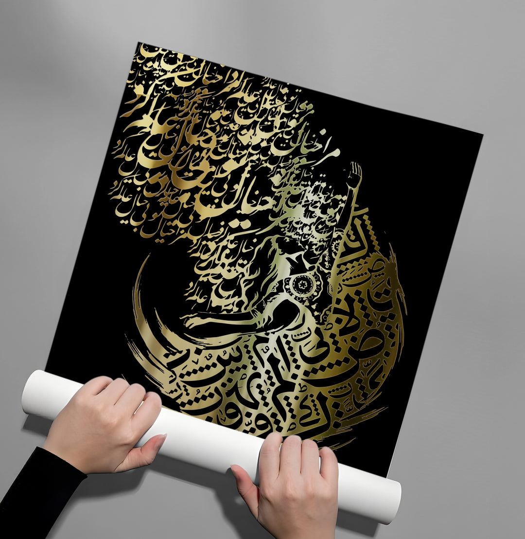 The exceptional Dynamic Motion - Gold Whirling Calligraphy print is a visually stunning depiction of spiritual artistry. This piece uses intricate metallic gold Arabic calligraphy to form a whirling, dancing figure, symbolizing the transcendent motion of Sufi Sema. The dense, layered script flows dramatically from the top, capturing the elegance and intensity of the movement against a deep black textured background. This highly artistic print is perfect for adding a spiritual, profound, and dramatically luxurious focal point to an artistic or contemplative space in Dubai.