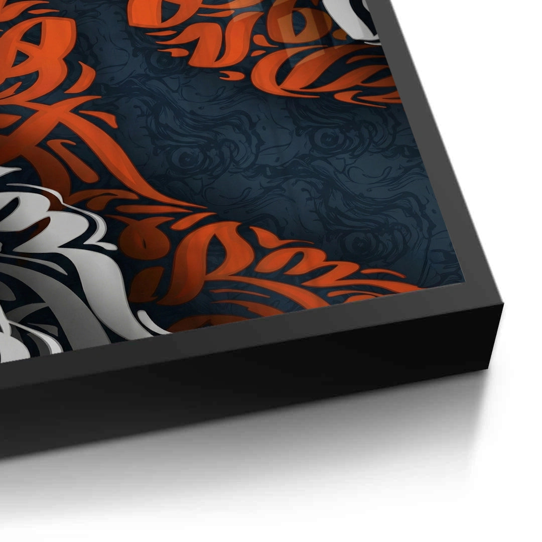 The mesmerizing Dynamic Wavy - 3D Calligraphy Flow print is a visually arresting piece of abstract Islamic art. This contemporary masterpiece utilizes dense, stylized Arabic script to create an illusion of wavy, cascading fabric or liquid flow. Central streams of vibrant orange calligraphy dramatically weave through folds of contrasting black and white script, all set against a deep midnight blue textured background. This piece is perfect for adding a bold, artistic, and eye-catching textural accent to a modern wall in Dubai.