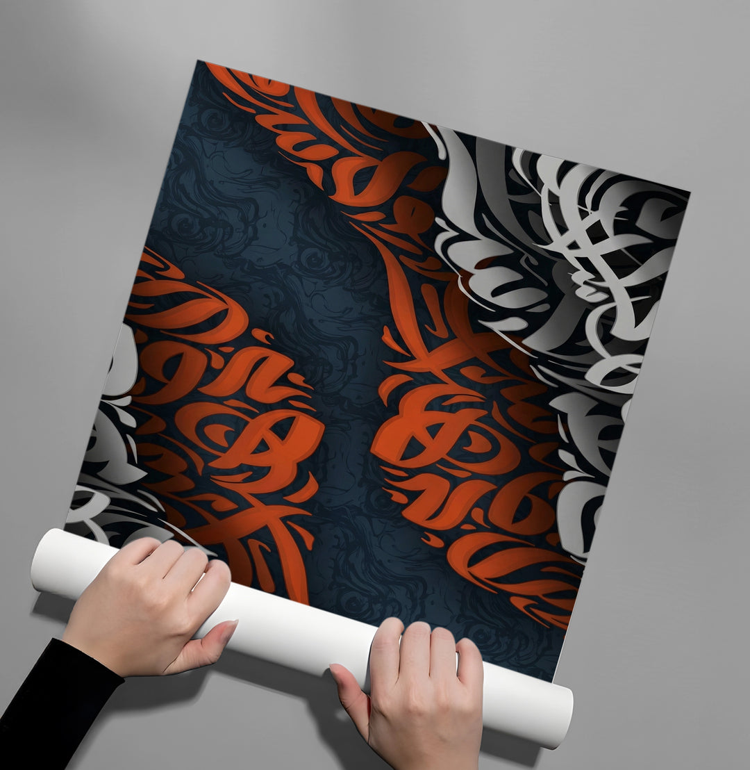 The mesmerizing Dynamic Wavy - 3D Calligraphy Flow print is a visually arresting piece of abstract Islamic art. This contemporary masterpiece utilizes dense, stylized Arabic script to create an illusion of wavy, cascading fabric or liquid flow. Central streams of vibrant orange calligraphy dramatically weave through folds of contrasting black and white script, all set against a deep midnight blue textured background. This piece is perfect for adding a bold, artistic, and eye-catching textural accent to a modern wall in Dubai.