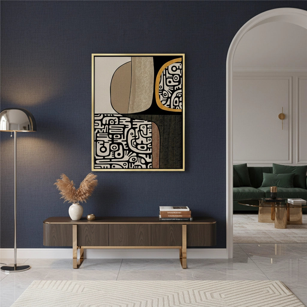 The romantic Echoes of the Old World - Arabian Horse & Script print beautifully merges classical painting with spiritual script. The focal point is a majestic white Arabian horse, draped in a richly patterned, traditional saddle blanket. Bold, sweeping white Arabic calligraphy overlays the foreground, resting against a distressed, antique-style canvas with ornate floral borders. This artwork is a timeless homage to equestrian heritage and deep cultural roots. Ideal for adding nostalgic, classic, and elegant luxury to a majlis or sophisticated living space in Dubai.