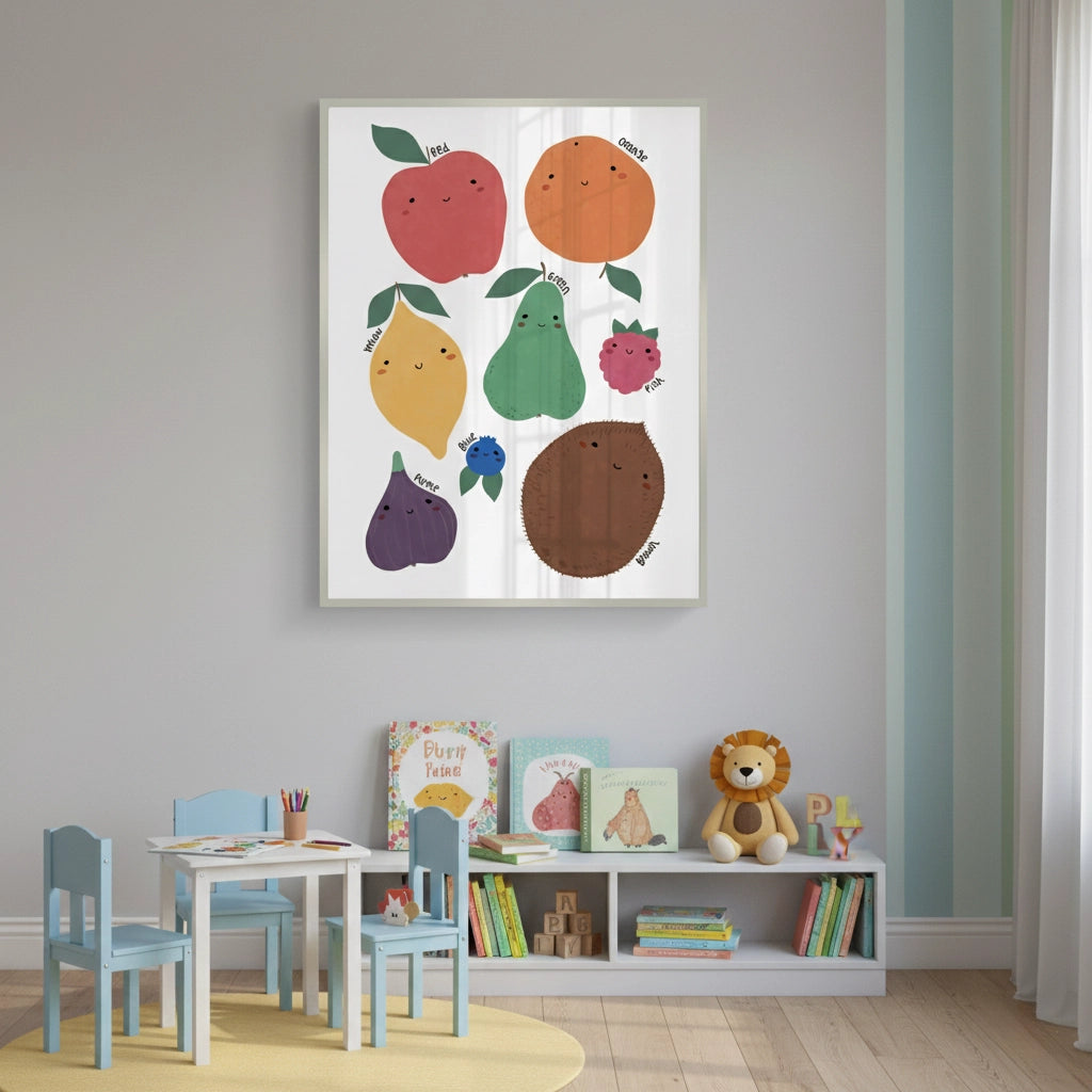 The vibrant and cheerful Educational Fruit and Color print is the perfect interactive piece for a young child's room or classroom. This delightful illustration features eight friendly, smiling fruits, each correctly labeled with its corresponding color, covering the entire spectrum from Red to Brown. With its bold colours and cute characters, this artwork makes learning fruits and basic colors fun and engaging. It is an ideal addition to create a bright, educational, and positive atmosphere in a child’s room or play area in Dubai.