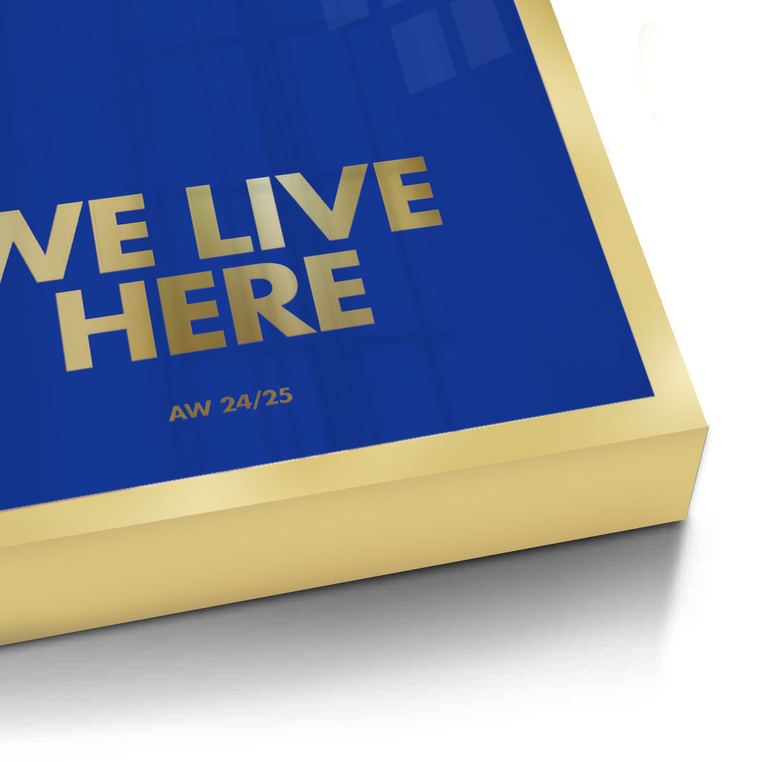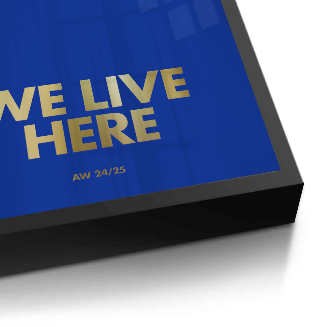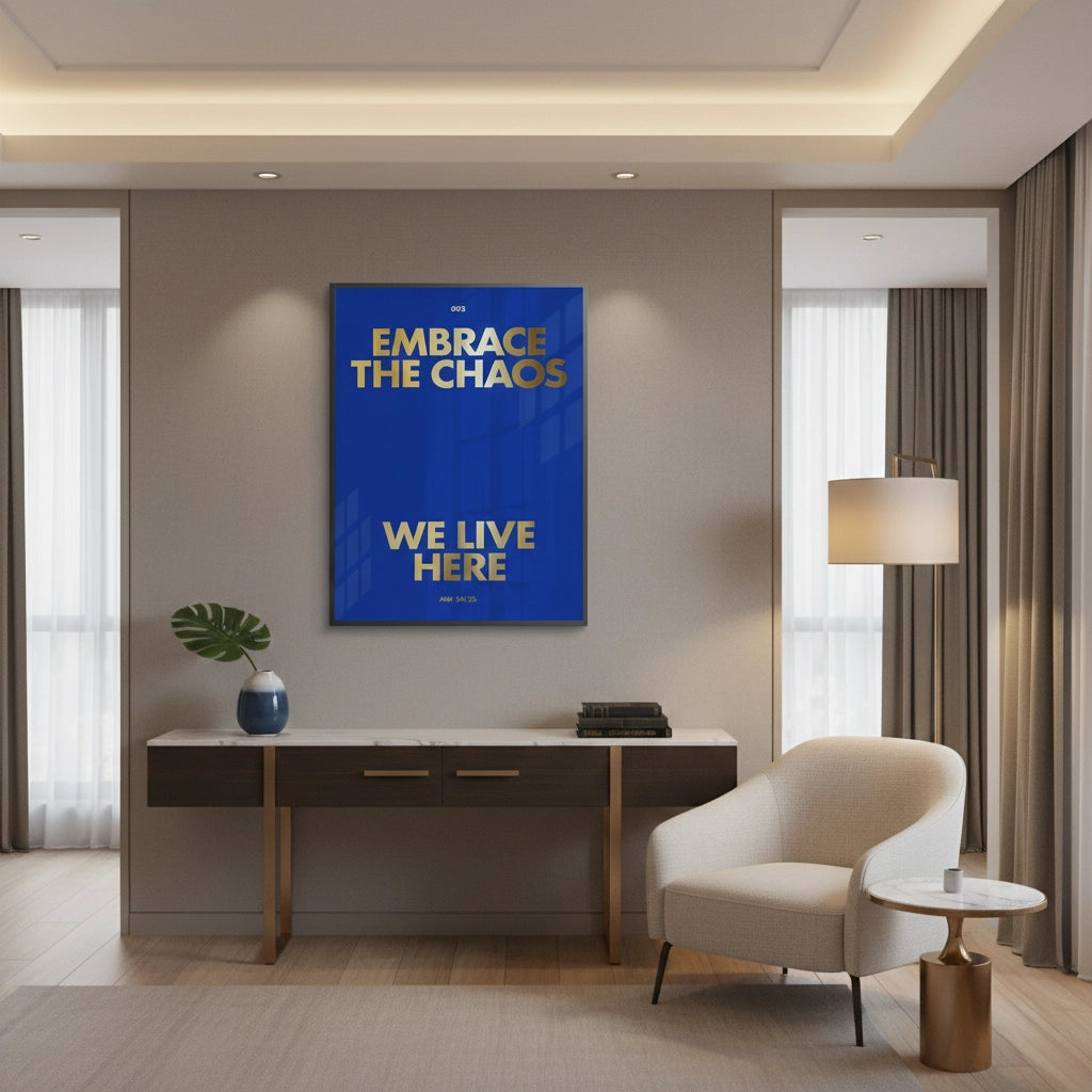 The striking Embrace The Chaos - Royal Blue & Gold Fashion Statement print is a high-fashion, unapologetic piece of modern art. The bold statements "EMBRACE THE CHAOS" and "WE LIVE HERE" are rendered in large, impactful metallic gold sans-serif typography. The dazzling gold is set against a vibrant, deep royal blue canvas with a subtle vertical pinstripe texture, amplifying the high-contrast luxury appeal. Accents like "AW 24/25" lend the piece a chic, editorial magazine cover aesthetic. Ideal for adding an edgy, fashionable, and sophisticated focal point to a contemporary loft or stylish space in Dubai.