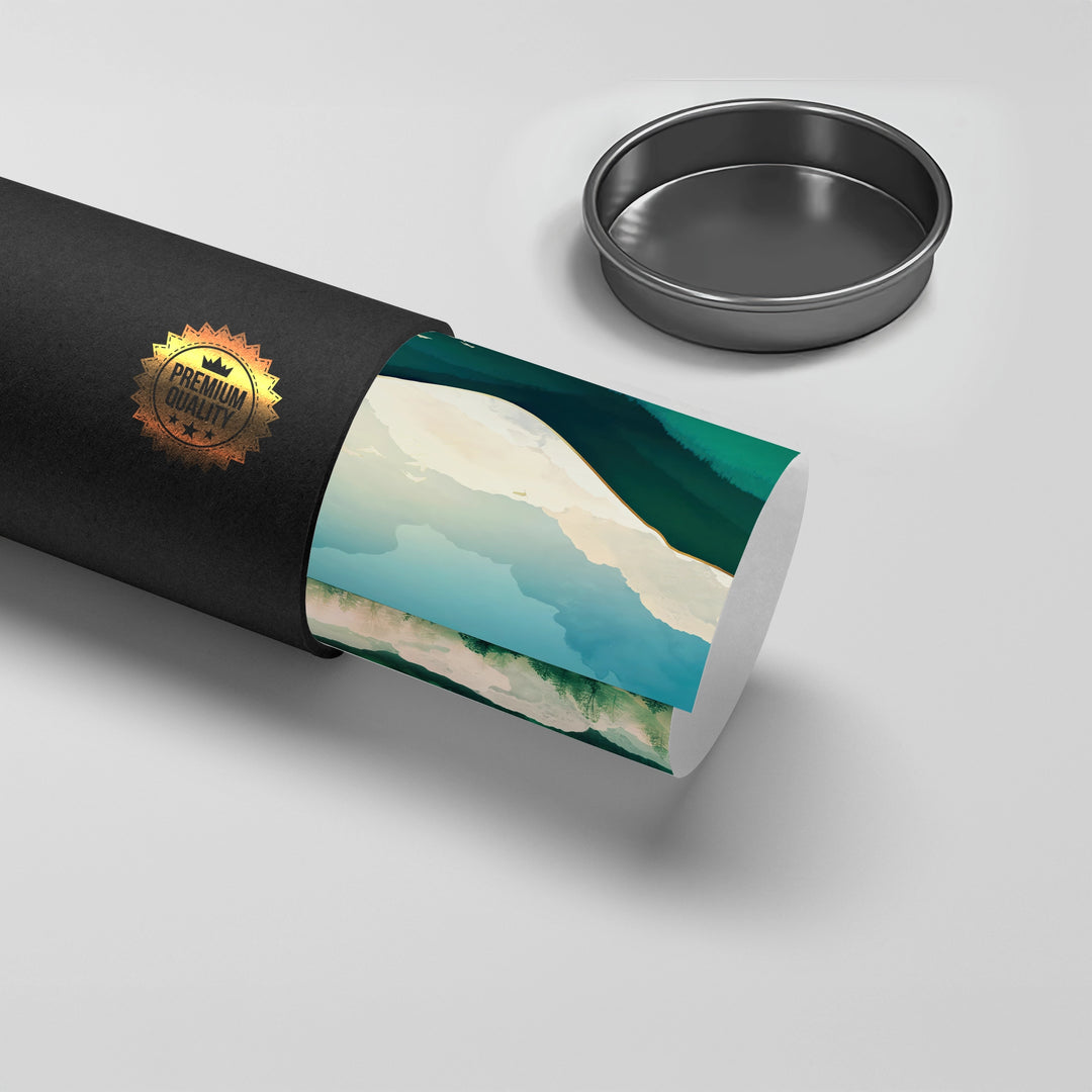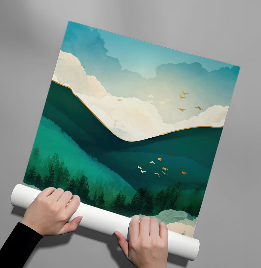 The immersive Emerald Forest Abstract print is a luxurious piece that captures the depth and mystery of a misty, forested landscape. This canvas uses a rich palette of emerald green and deep teal, contrasted beautifully with soft white clouds and elegant metallic gold foil accents along the mountain peaks. It offers a statement of natural luxury and brings sophisticated, contemporary color and tranquility to any living space or corporate office in Dubai.