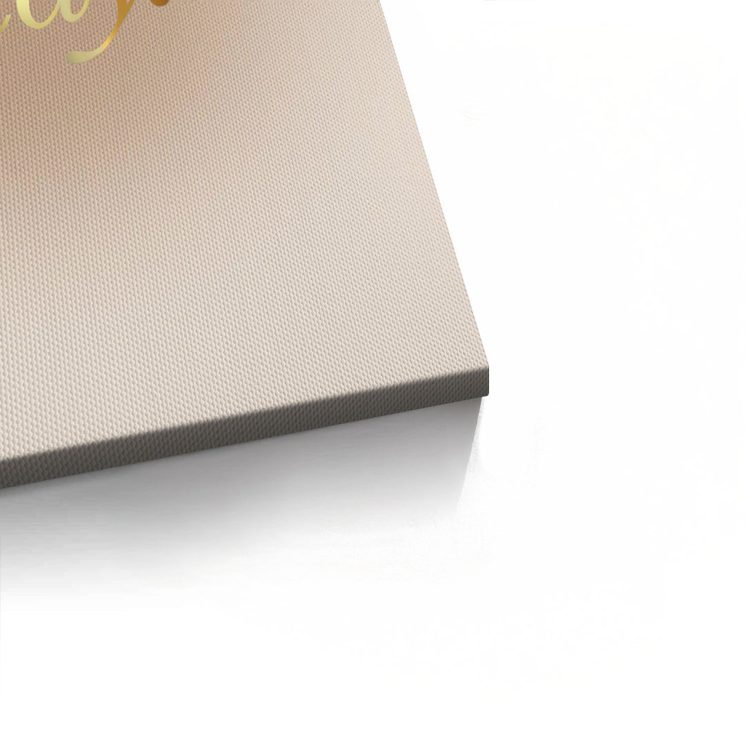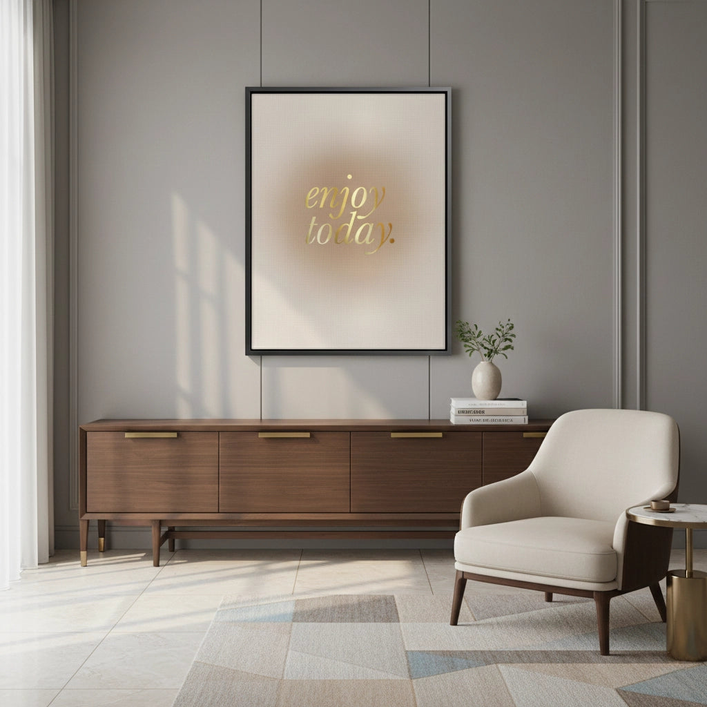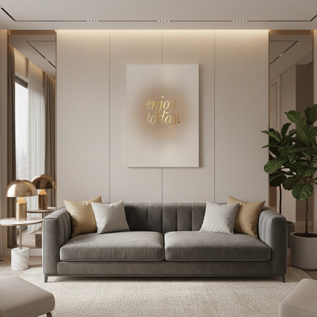 The serene Enjoy Today - Gold Script Typography print is a luxurious reminder to embrace the present moment. The simple, mindful message "enjoy today." is beautifully rendered in delicate, flowing metallic gold script typography. The radiant gold contrasts softly with the soft, pale nude/beige canvas, which features a subtle vertical pinstripe texture and a gentle glow. This piece offers a calm, feminine, and sophisticated motivational accent. Ideal for a tranquil bedroom, dressing room, or a peaceful living space in Dubai.
