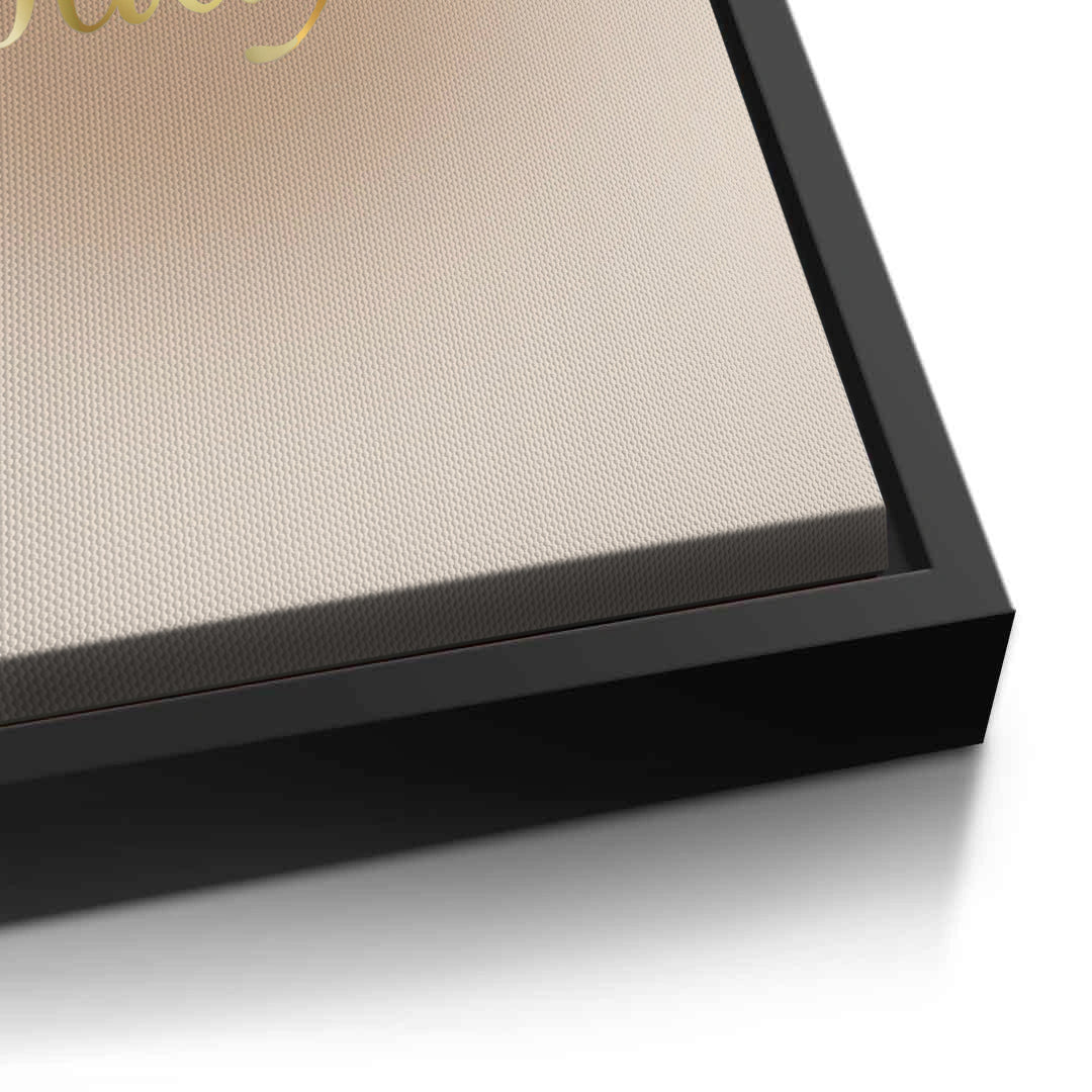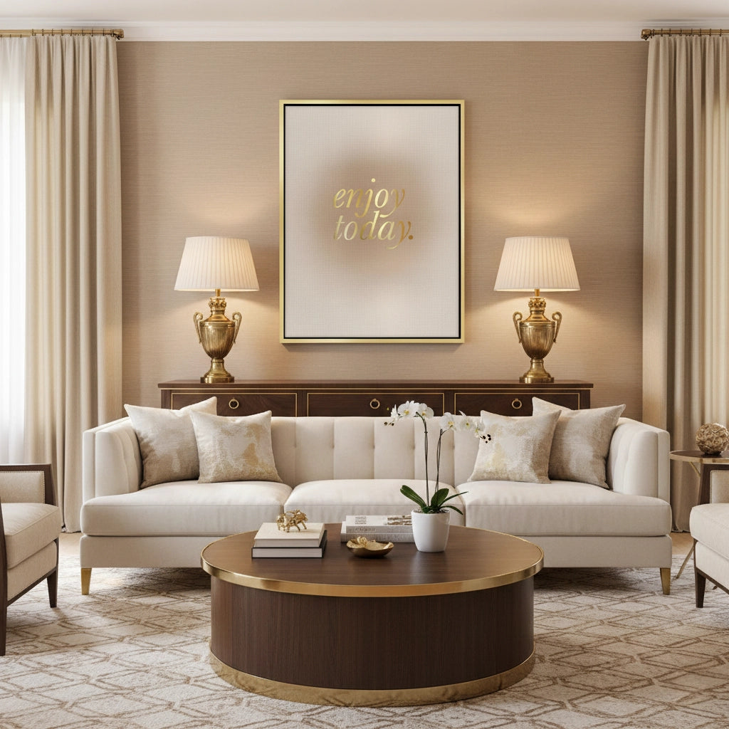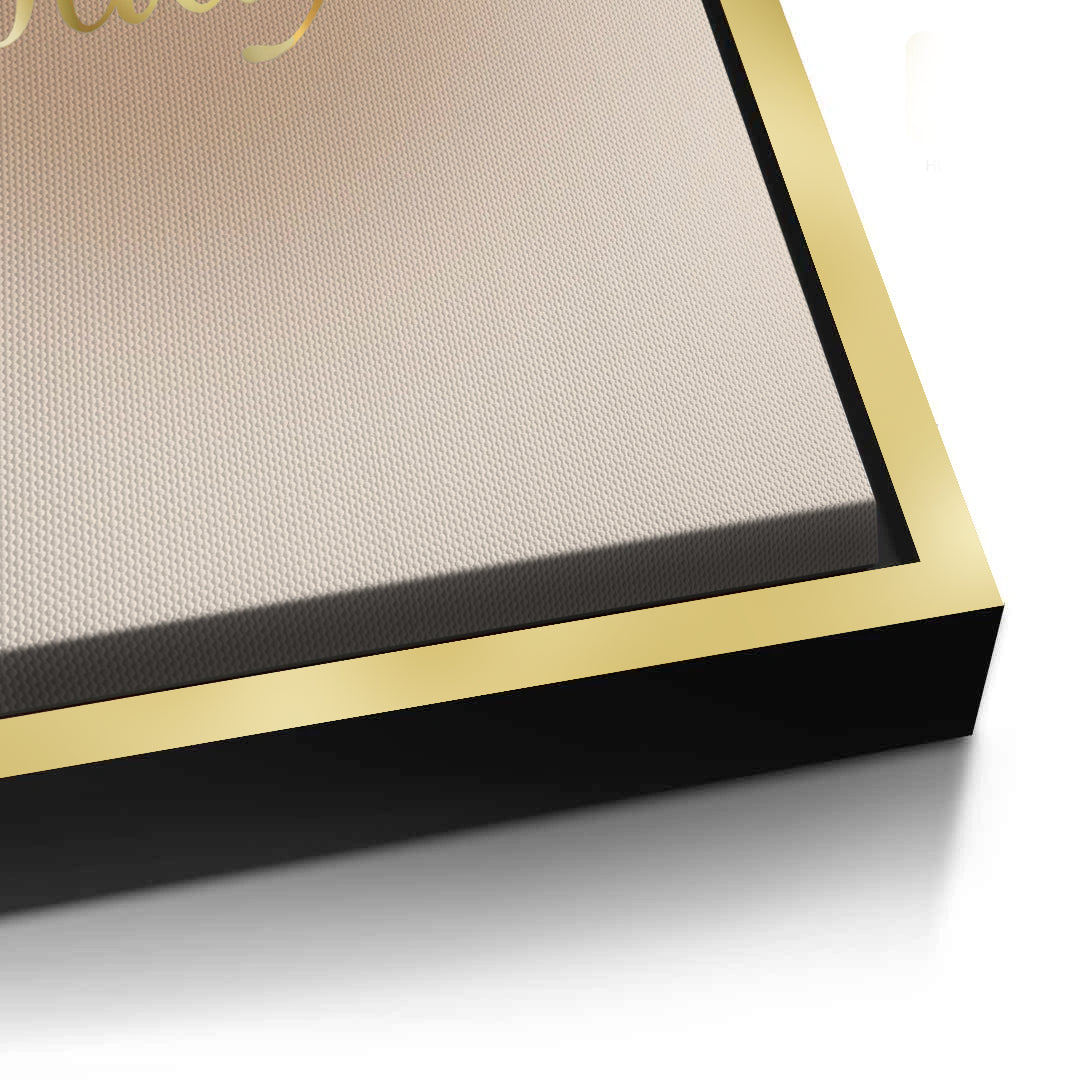 The serene Enjoy Today - Gold Script Typography print is a luxurious reminder to embrace the present moment. The simple, mindful message "enjoy today." is beautifully rendered in delicate, flowing metallic gold script typography. The radiant gold contrasts softly with the soft, pale nude/beige canvas, which features a subtle vertical pinstripe texture and a gentle glow. This piece offers a calm, feminine, and sophisticated motivational accent. Ideal for a tranquil bedroom, dressing room, or a peaceful living space in Dubai.