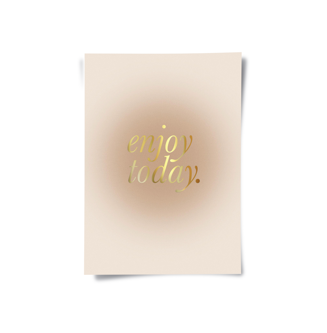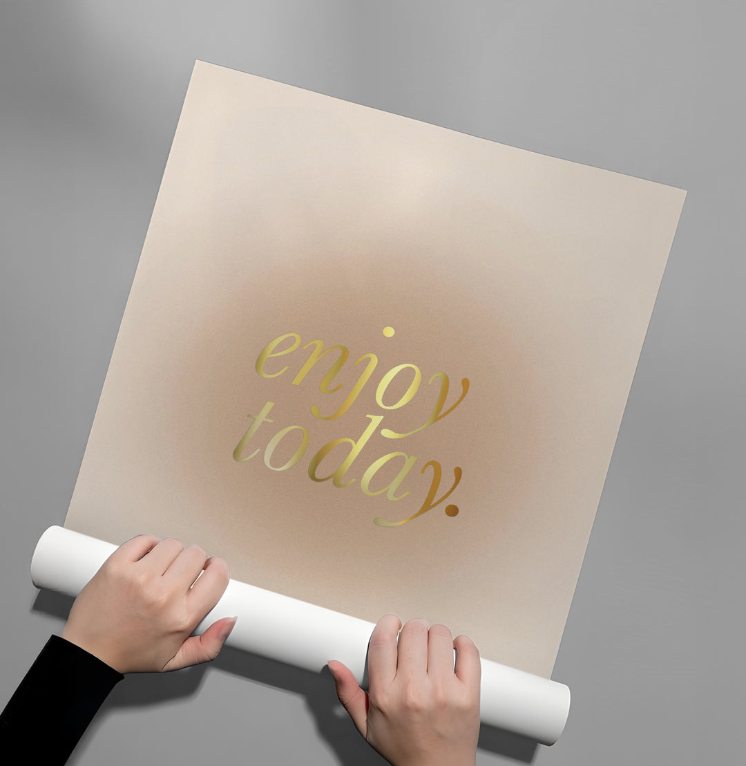 The serene Enjoy Today - Gold Script Typography print is a luxurious reminder to embrace the present moment. The simple, mindful message "enjoy today." is beautifully rendered in delicate, flowing metallic gold script typography. The radiant gold contrasts softly with the soft, pale nude/beige canvas, which features a subtle vertical pinstripe texture and a gentle glow. This piece offers a calm, feminine, and sophisticated motivational accent. Ideal for a tranquil bedroom, dressing room, or a peaceful living space in Dubai.